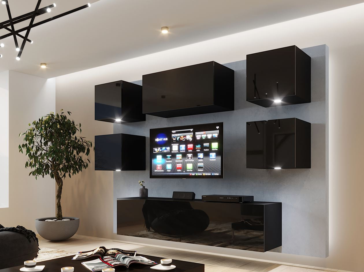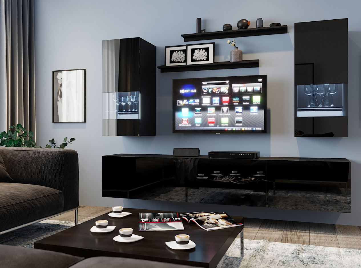 Obývací stěna s LED modrým osvětlením CHEMUNG 3 - černá / lesklá černá