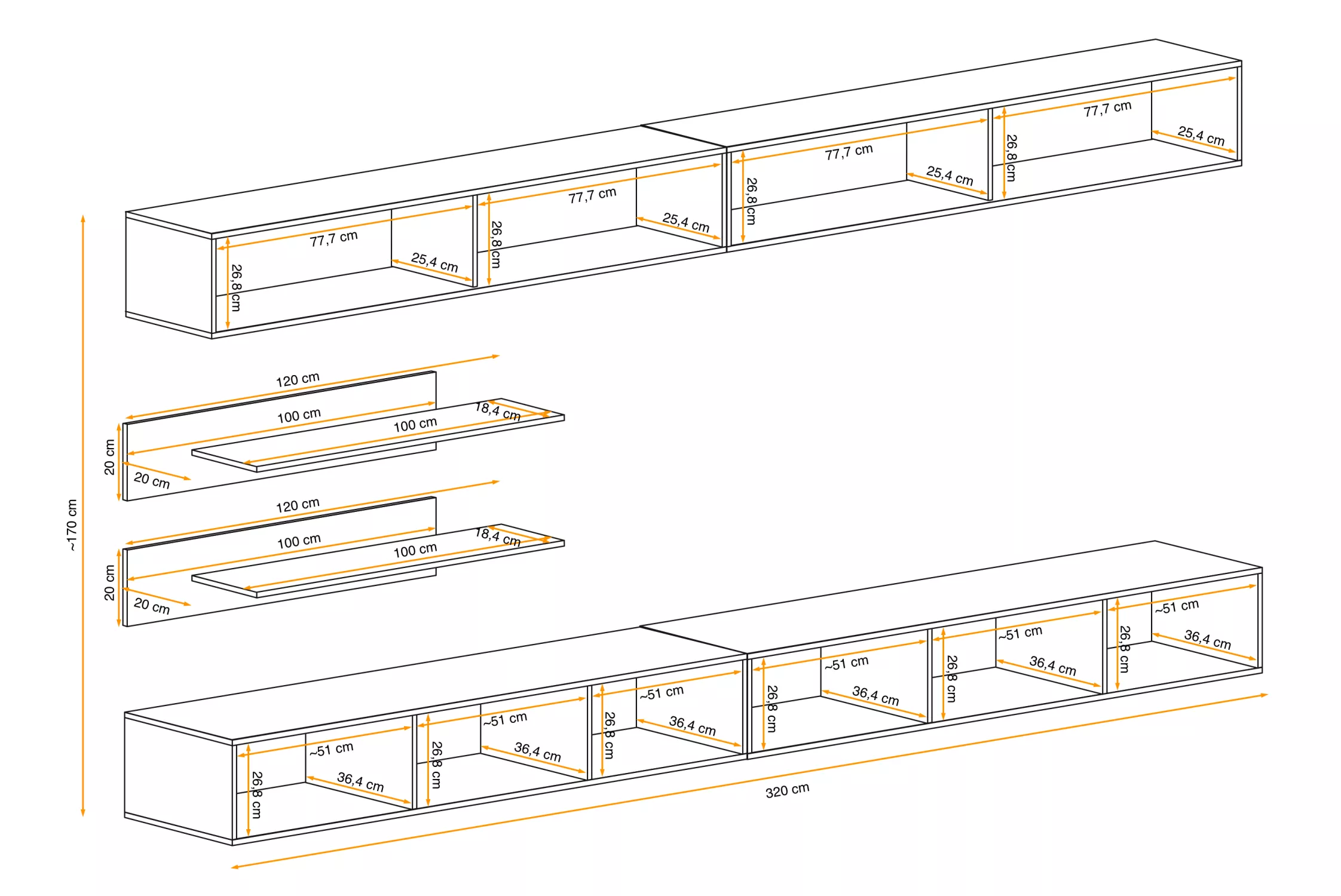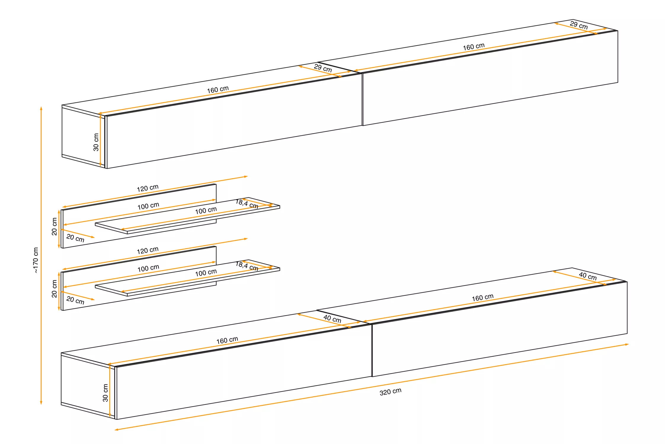 - závěsná skříňka horní (2x): 160x30x29 cm