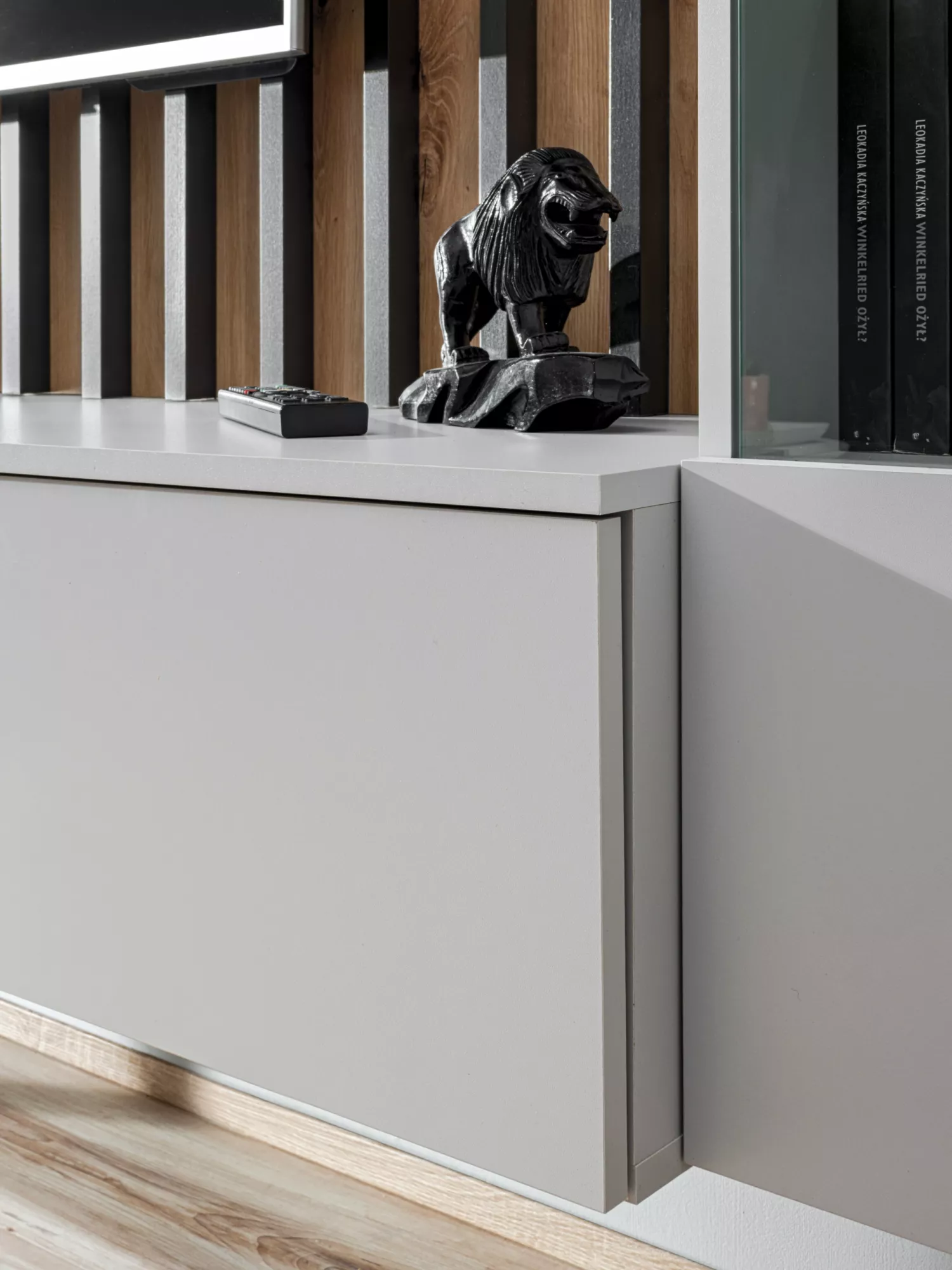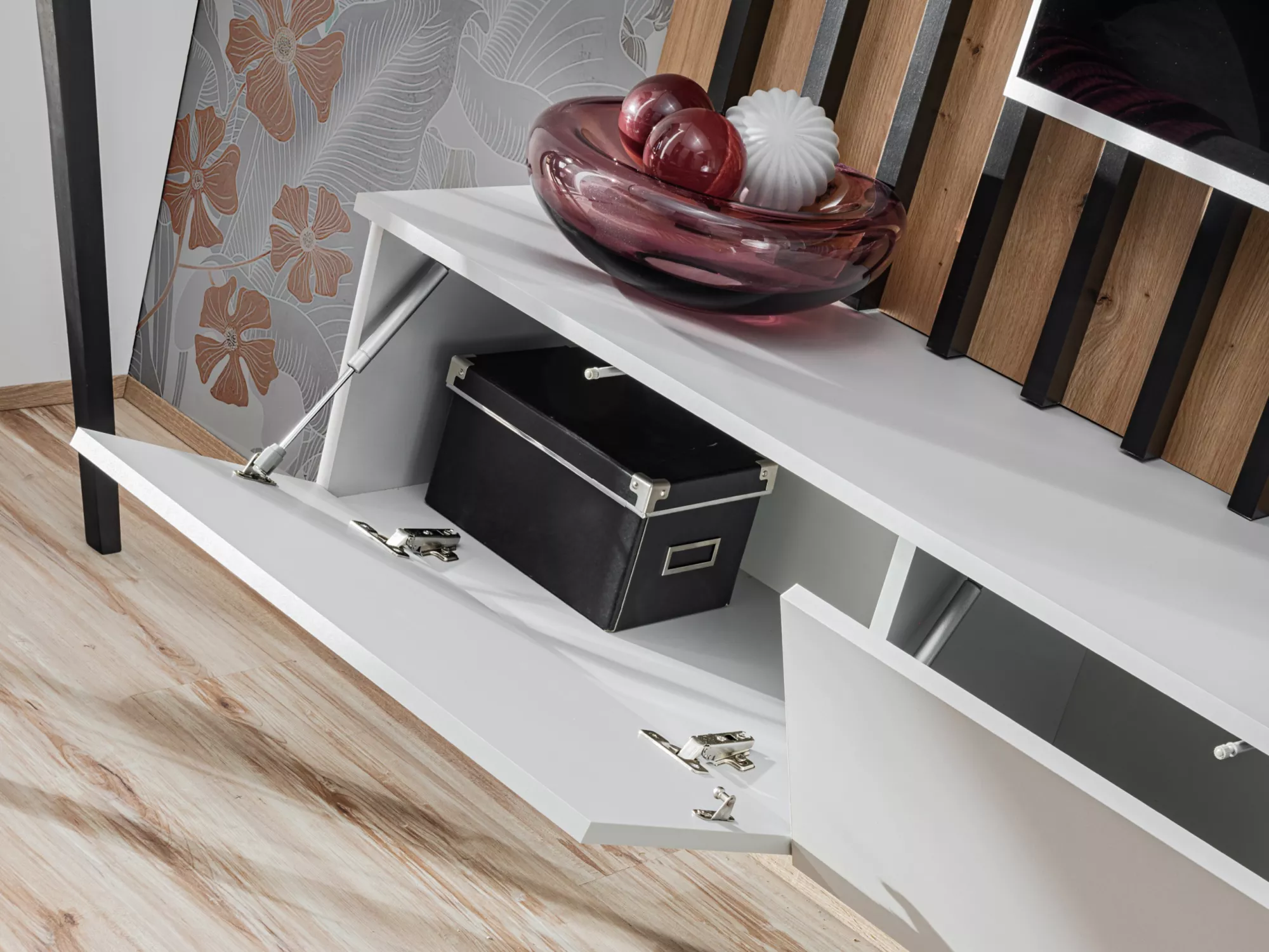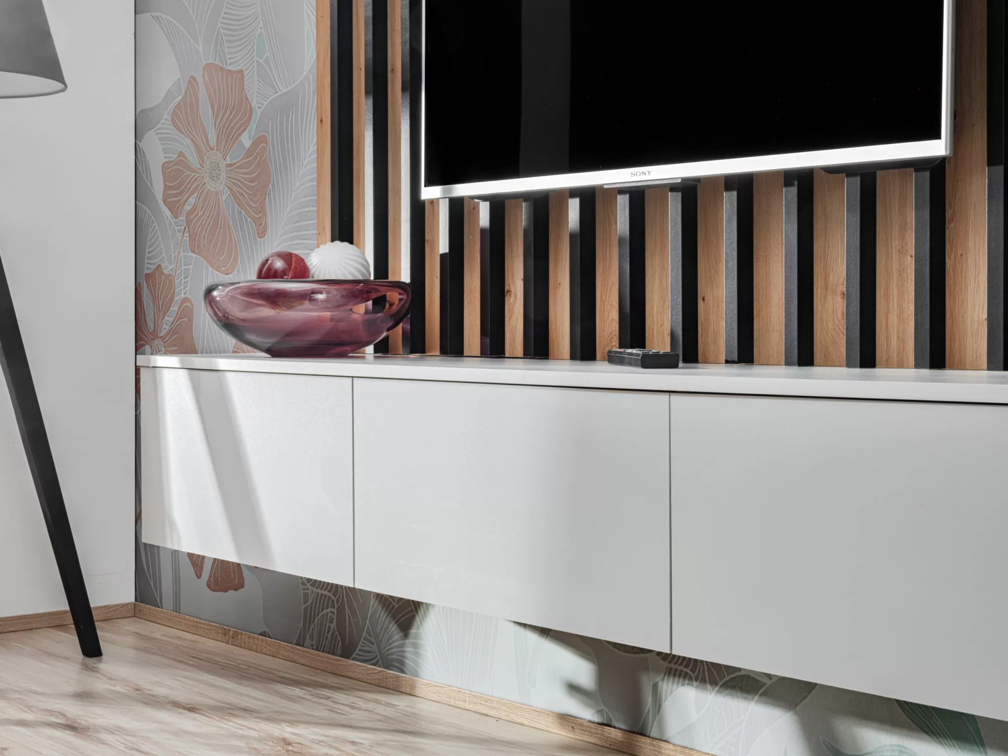 Obývací stěna s dekoračním nástěnným panelem CECILIA. Nabízí spoustu úložného prostoru v televizních stolcích, na poličkách si můžete vystavit dekorace a rodinné fotky. Otevírá se systémem push to open.