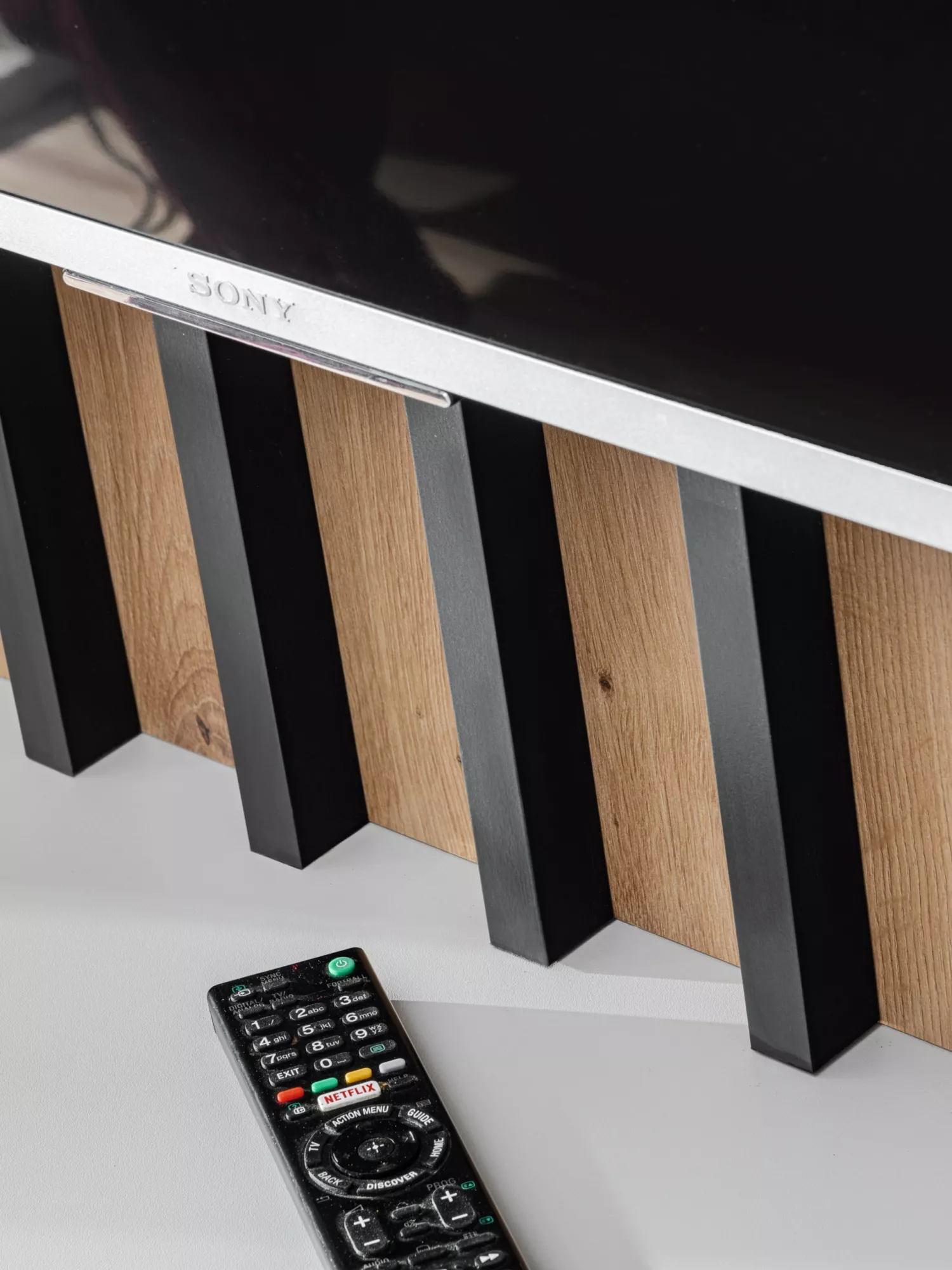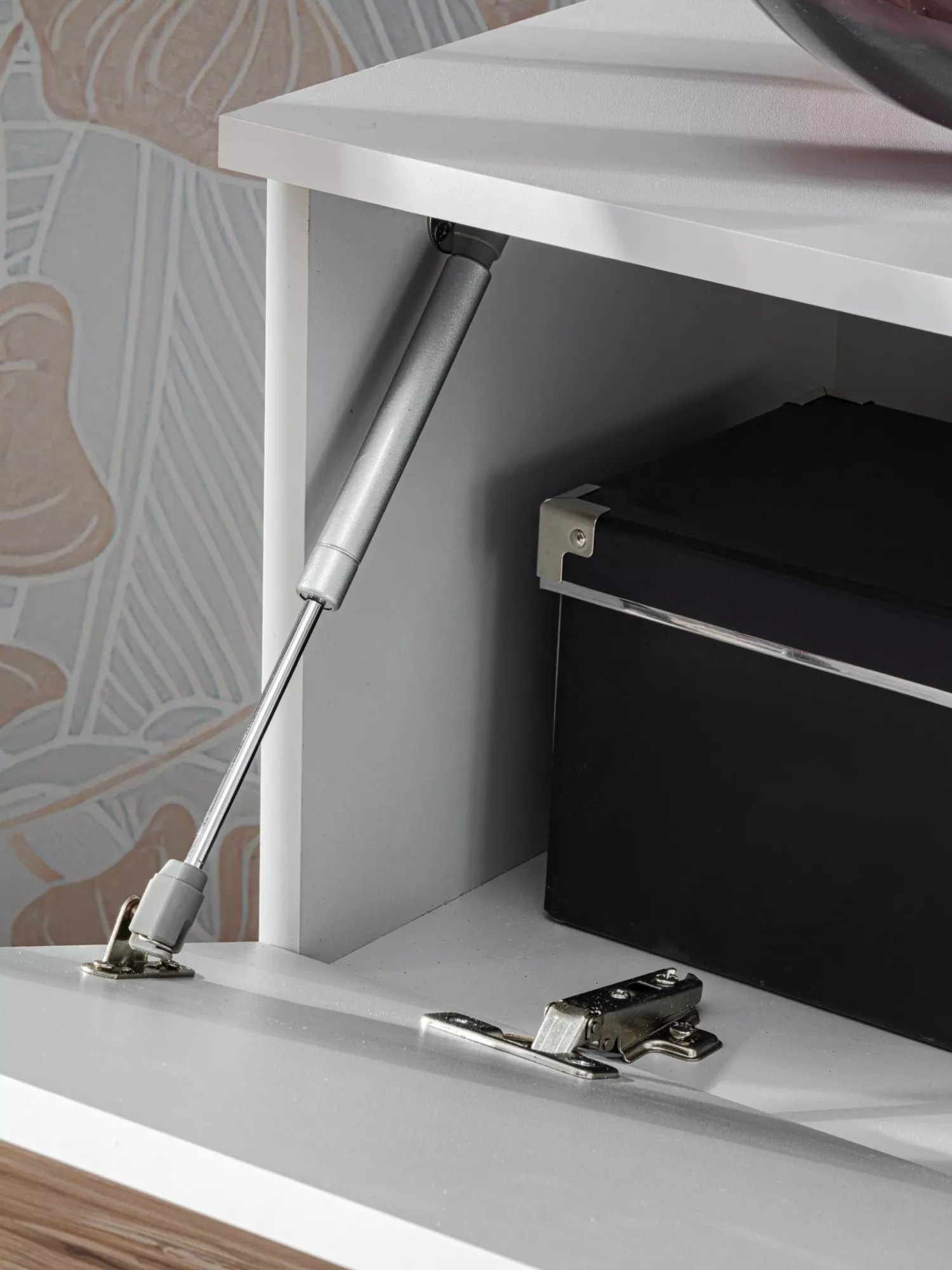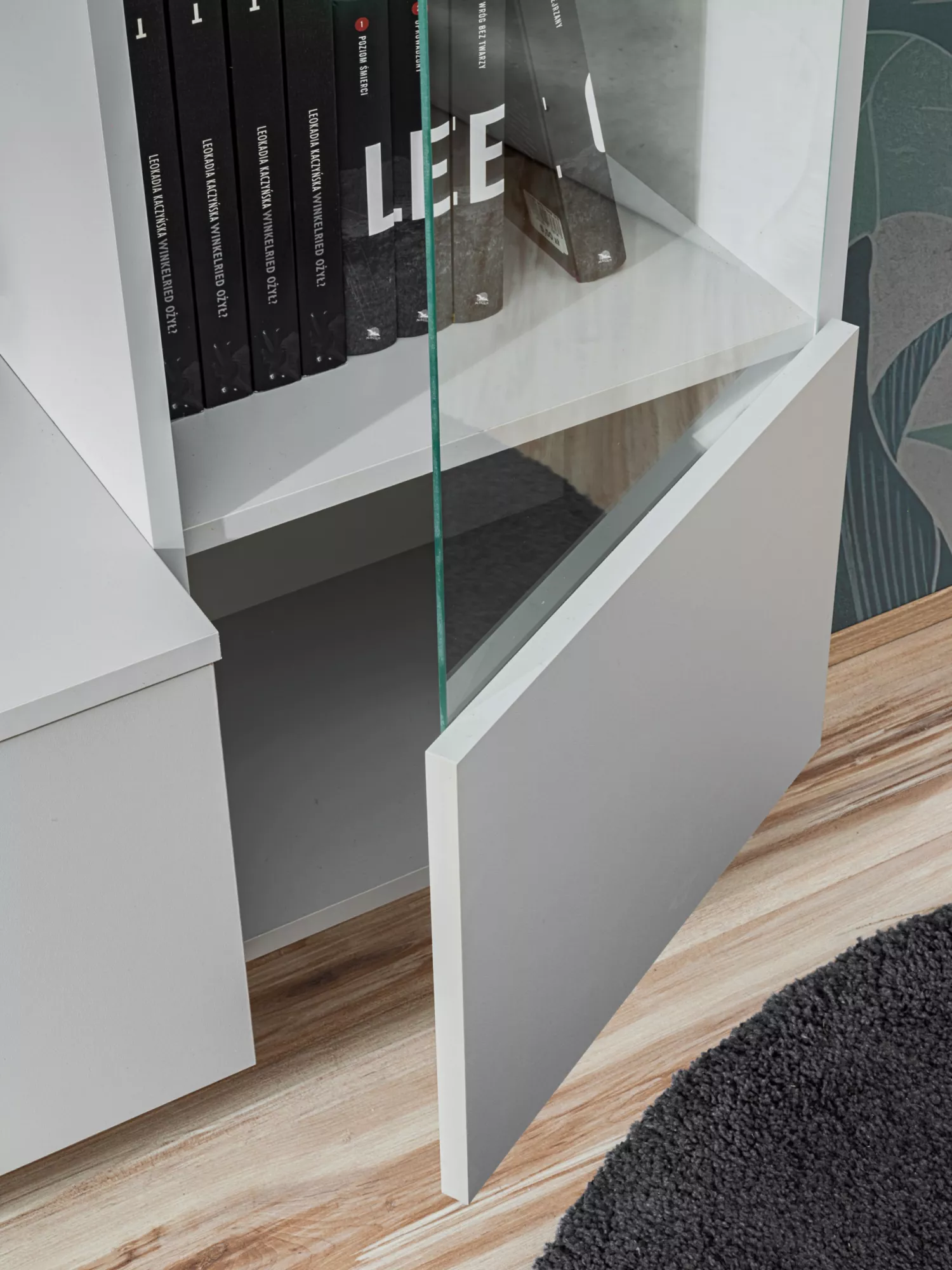 Obývací stěna s dekoračním nástěnným panelem CECILIA. Nabízí spoustu úložného prostoru v televizních stolcích, na poličkách si můžete vystavit dekorace a rodinné fotky. Otevírá se systémem push to open.