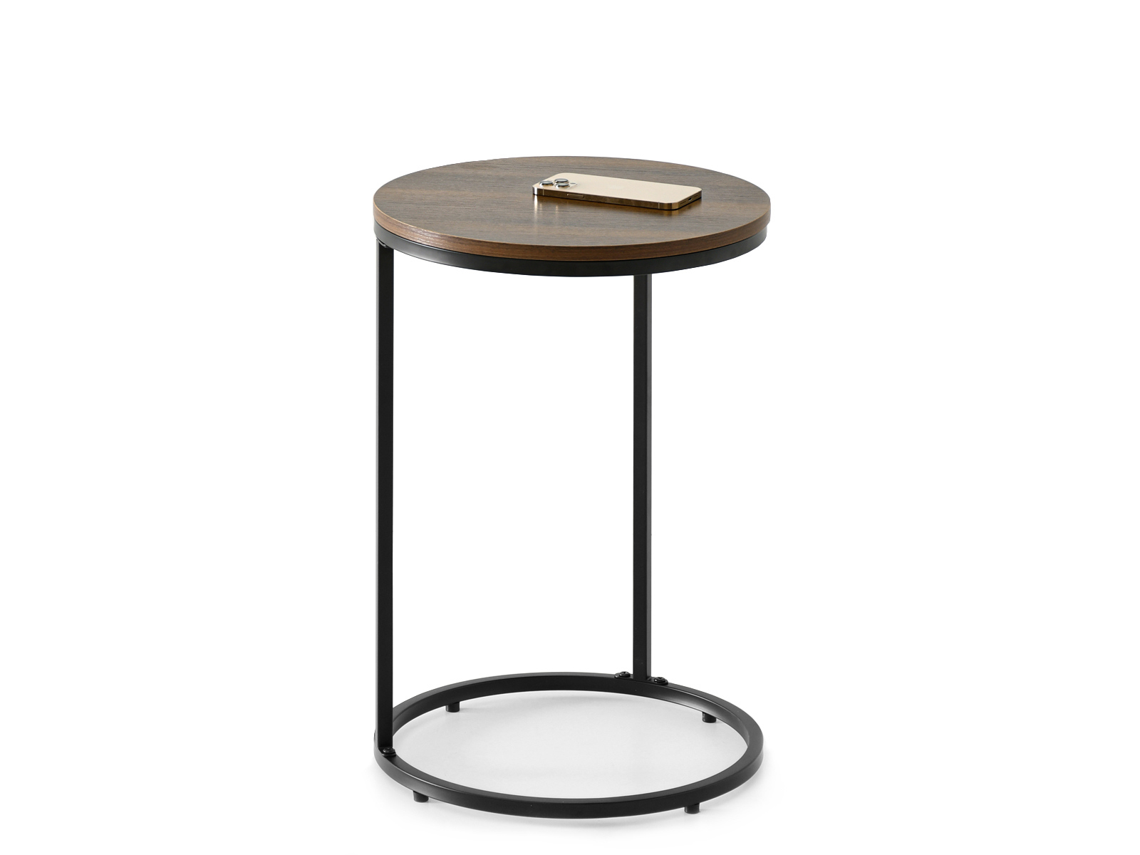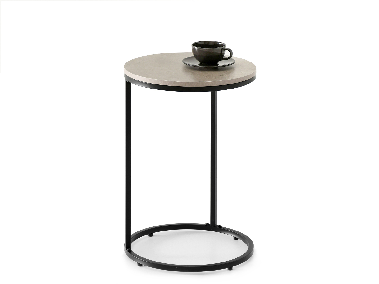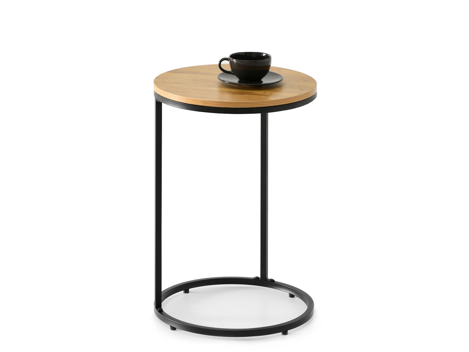 Kulatý odkládací stolek VILEM se vyznačuje minimalistickým provedením. Designový kovový rám doplňuje horní deska a praktická police z odolného LTD.