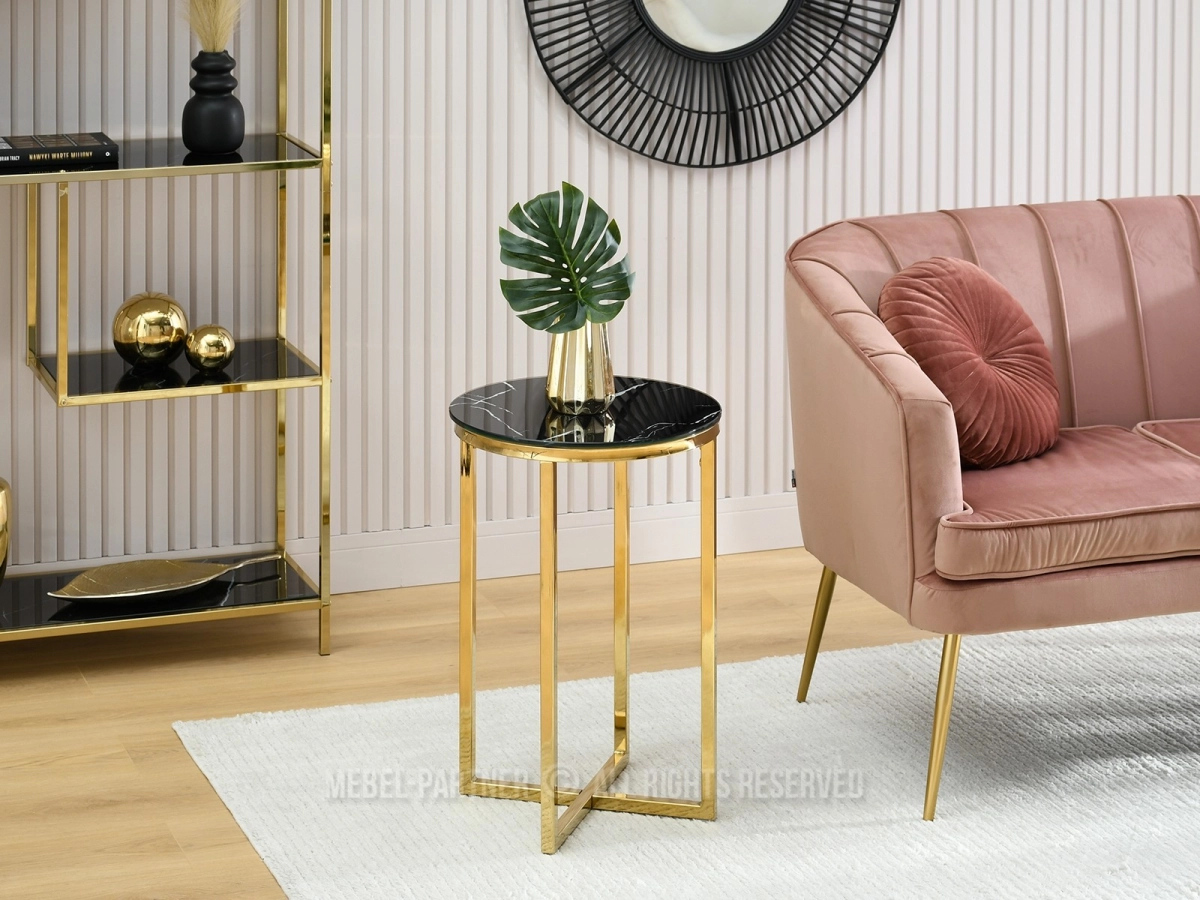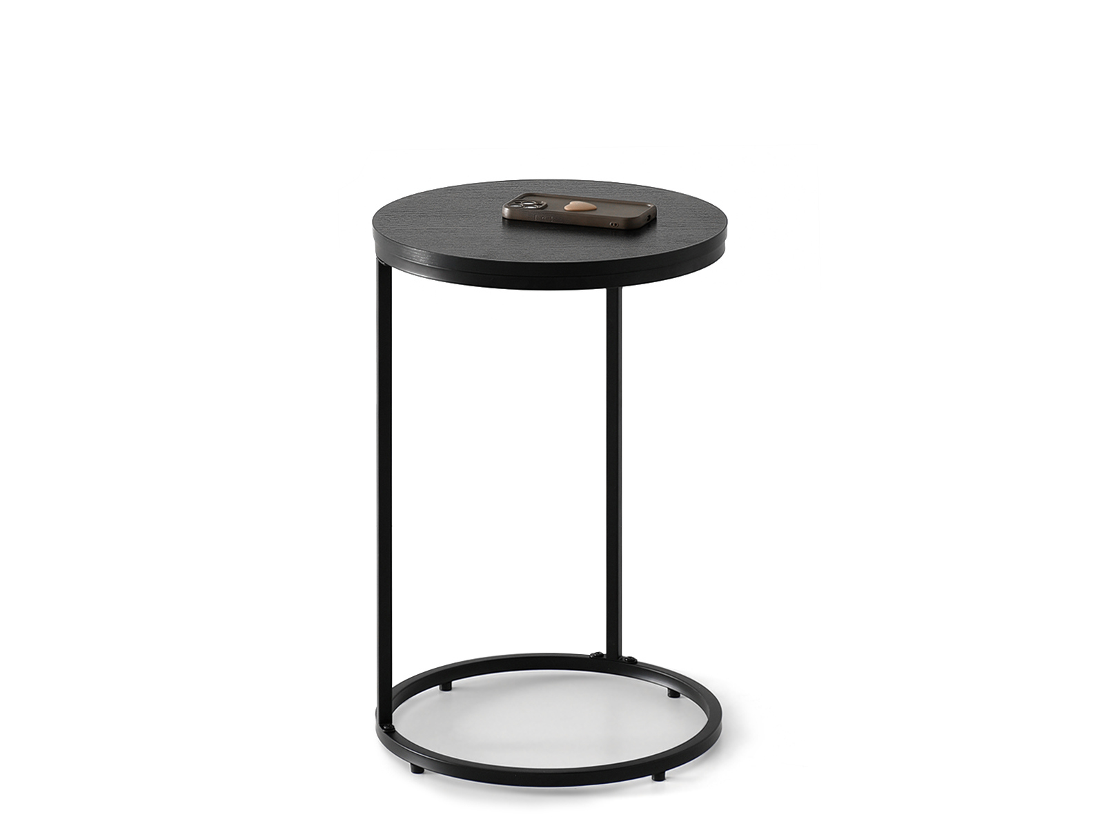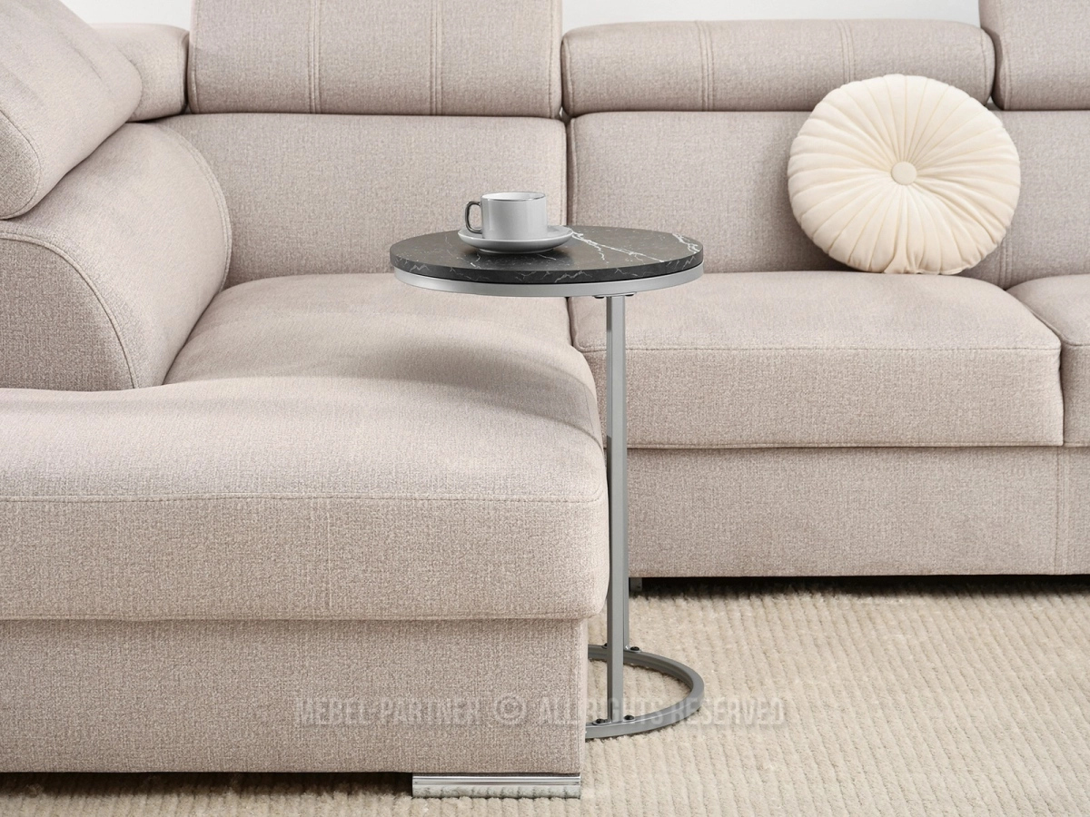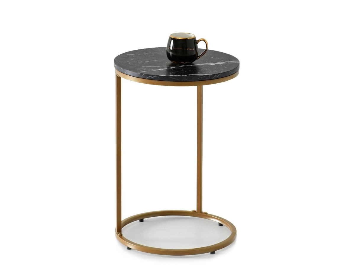 Kulatý odkládací stolek VILEM se vyznačuje minimalistickým provedením. Designový kovový rám doplňuje horní deska a praktická police z odolného LTD.