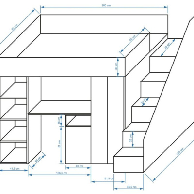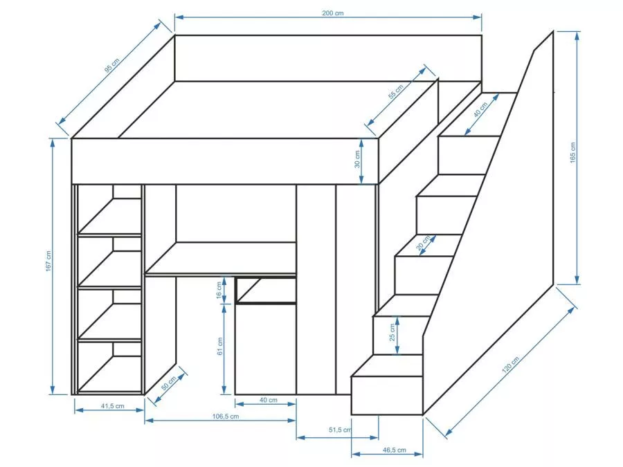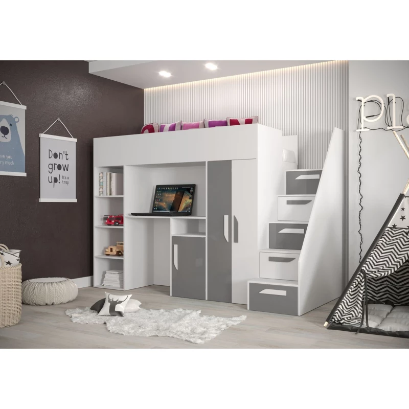 Postel kombinuje moderní design a dokonalou funkčnost. Vhodná je do malých prostorů. Součástí postele je skříň, psací stůl, otevřené police a schody s úložným prostorem. Při výrobě jsou použity LTD desky o síle 1,6 cm, které jsou opatřeny ABS hranami. Horní lůžko je dodávané bez matrace s deskou nahrazující rošt. Přední strany dvířek a zásuvek jsou v lesklém provedení, ostatní části v matu.