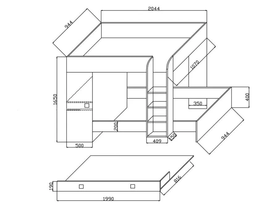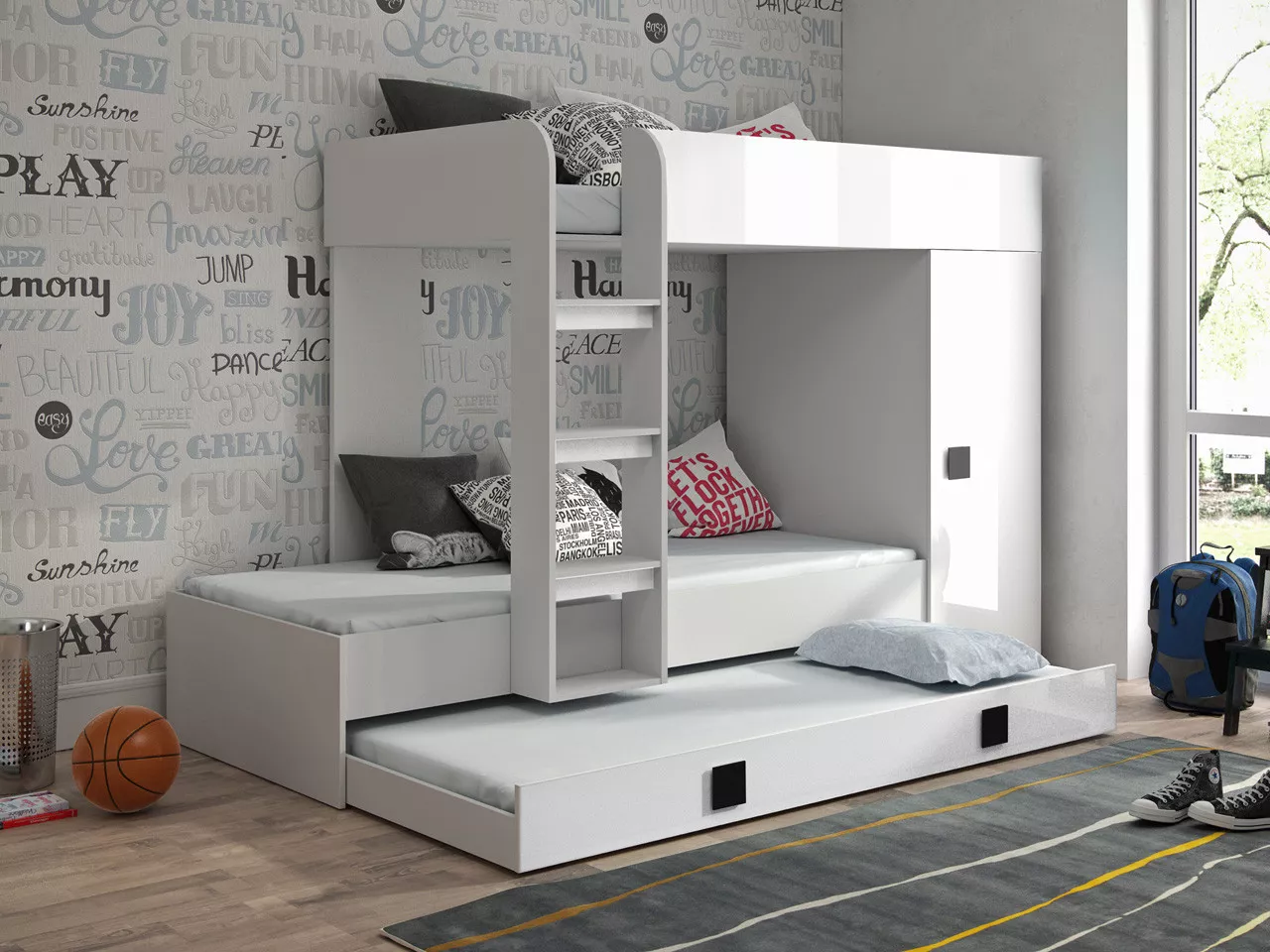 Dětská patrová postel může být vhodným řešením pro menší dětský pokoj. V horní části se nachází postel o ložné ploše 90 x 200 cm. V dolní části druhá postel o ložné ploše 85 x 200 cm. Pod ní třetí vysouvací postel také o rozměru 85 x 200 cm. Postele jsou včetně roštu, bez matrací.