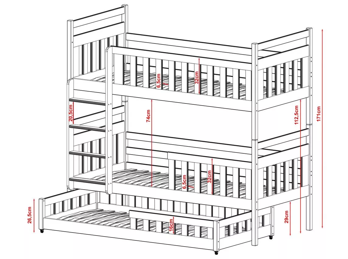 - horní a spodní lůžko: 97/171/208 cm; ložná plocha: 90x200 cm