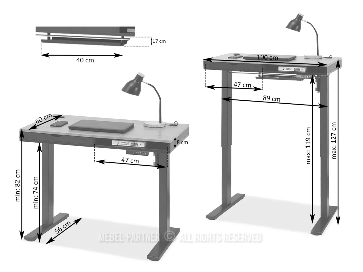 - elektricky nastavitelná výška stolu: 82-127 cm