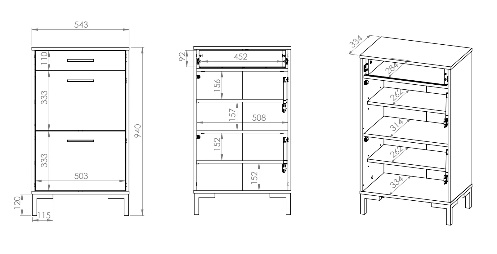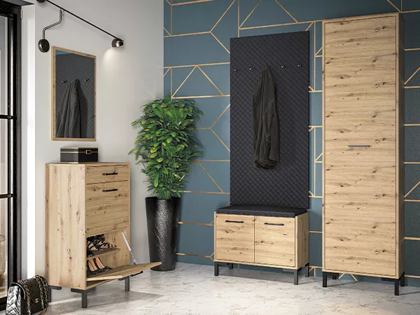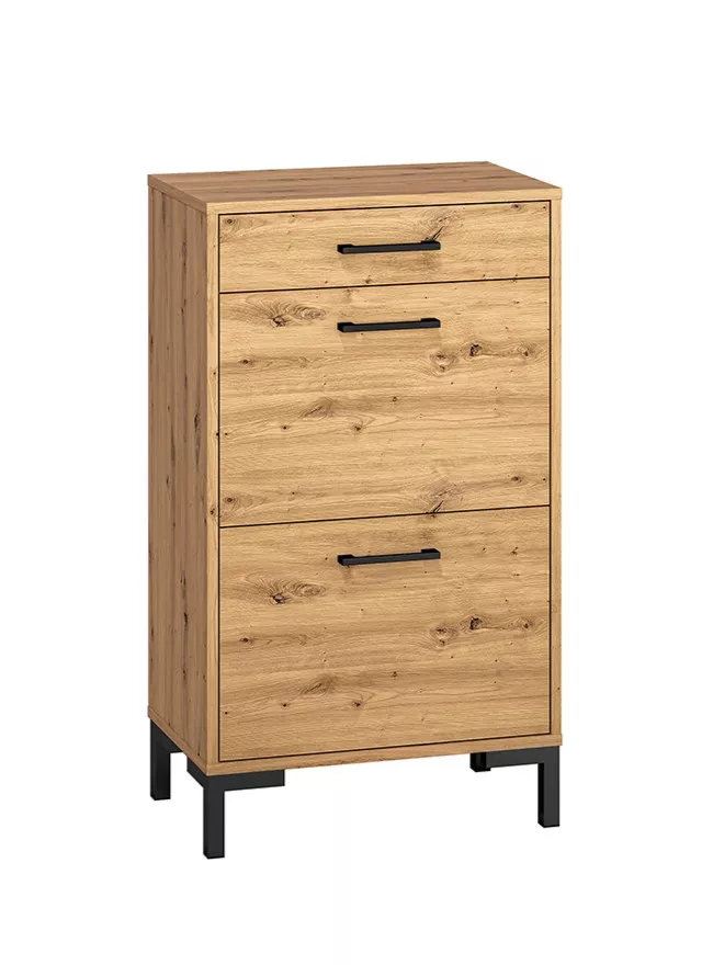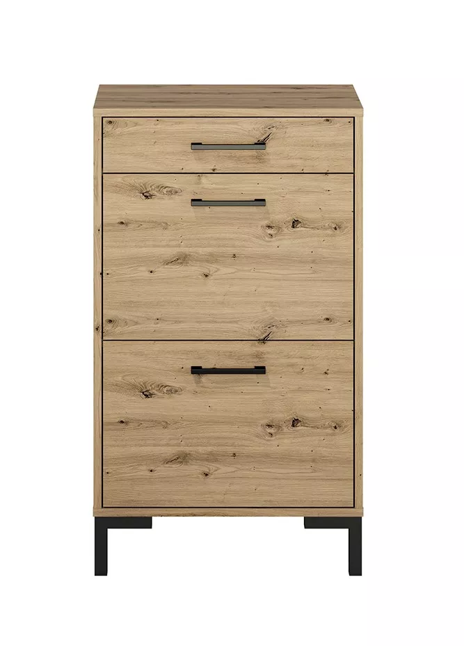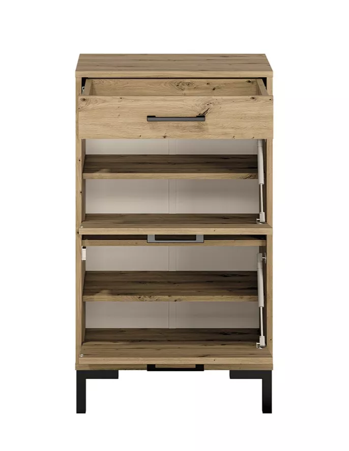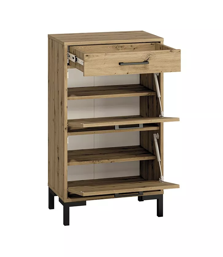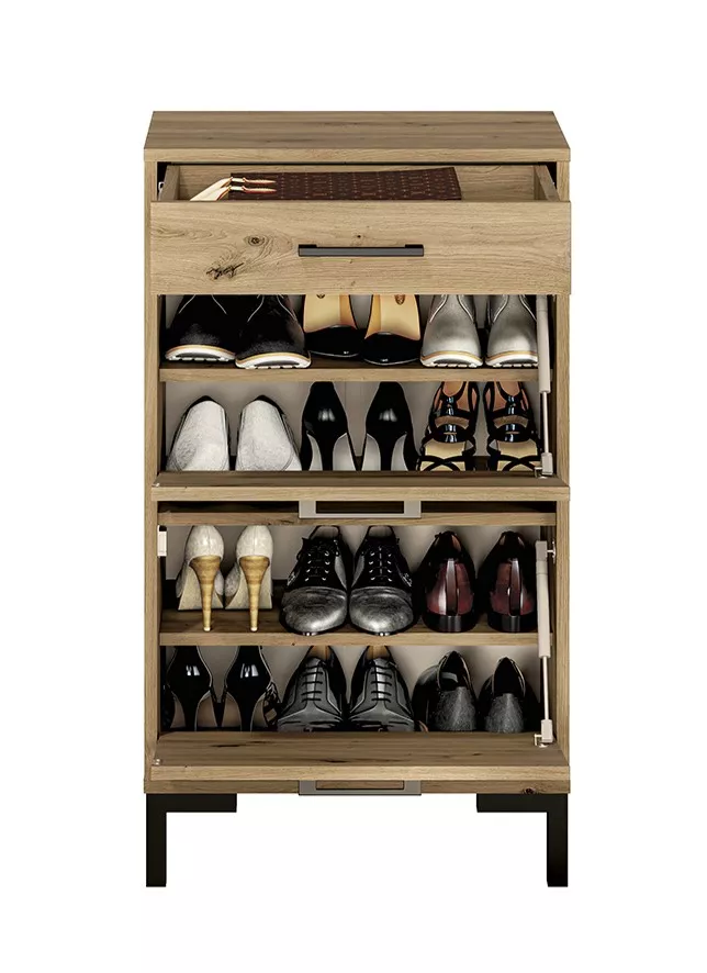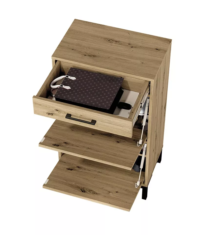 Vysoký botník BEDA se hodí do všech menších předsíní. Skládá se z plně výsuvného šuplíku, 2 sklopných dvířek a 3 polic.