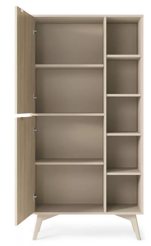 Regál s dvířky MEDEA se hodí do všech obývacích pokojů či studentských pokojů. Disponuje 4 menšími otevřenými policemi a 3 policemi, které jsou umístěné za 2 dvířky. Skřínky se otevírají pomocí elegantních zlatých úchytů.