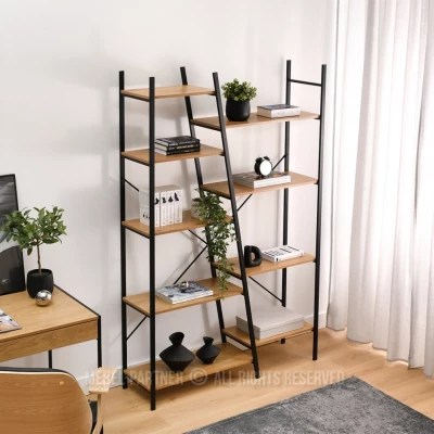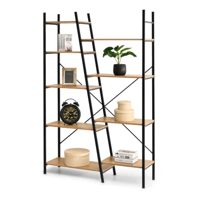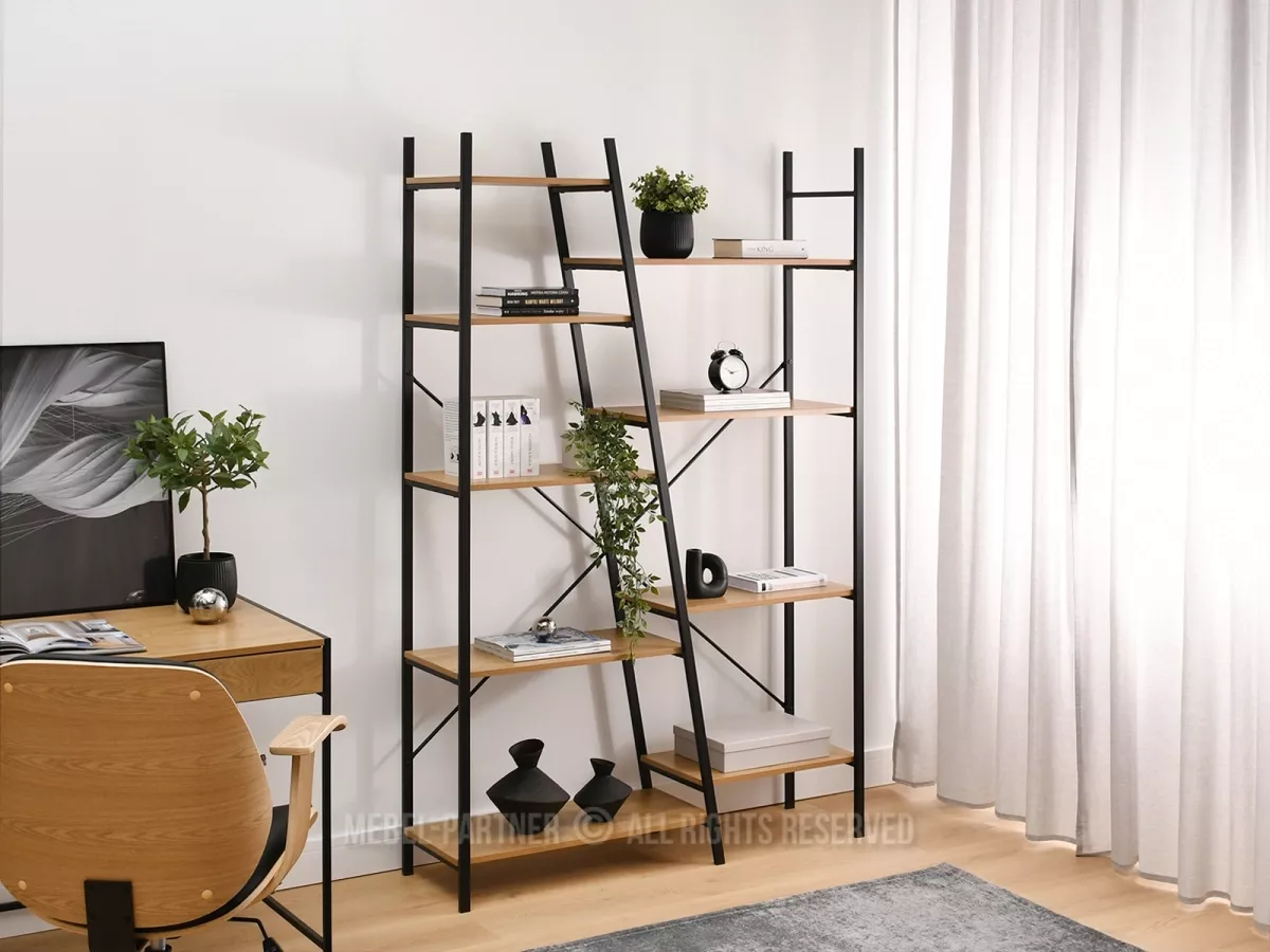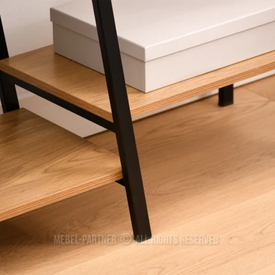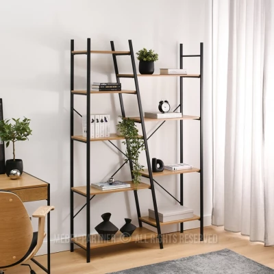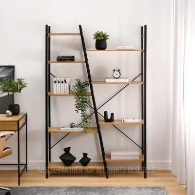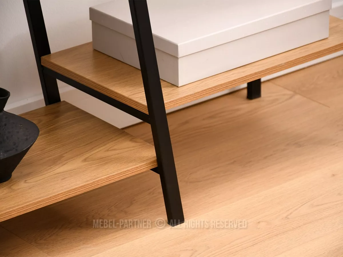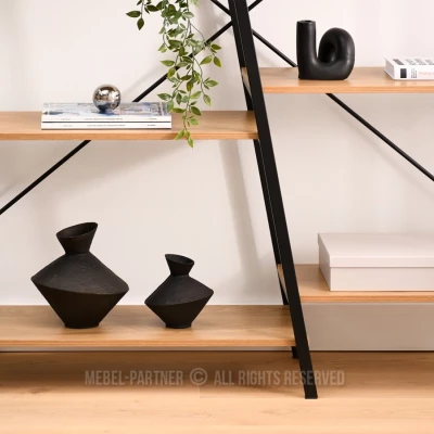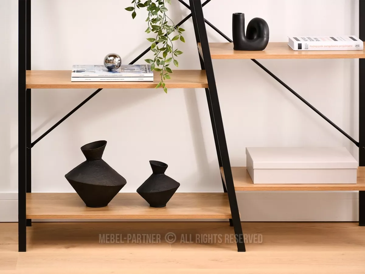 Široký policový regál MIHAS má centrální část záměrně nakloněnou, čímž vzniká zajímavý vizuální efekt. Pevnost regálu podtrhuje kovová konstrukce.