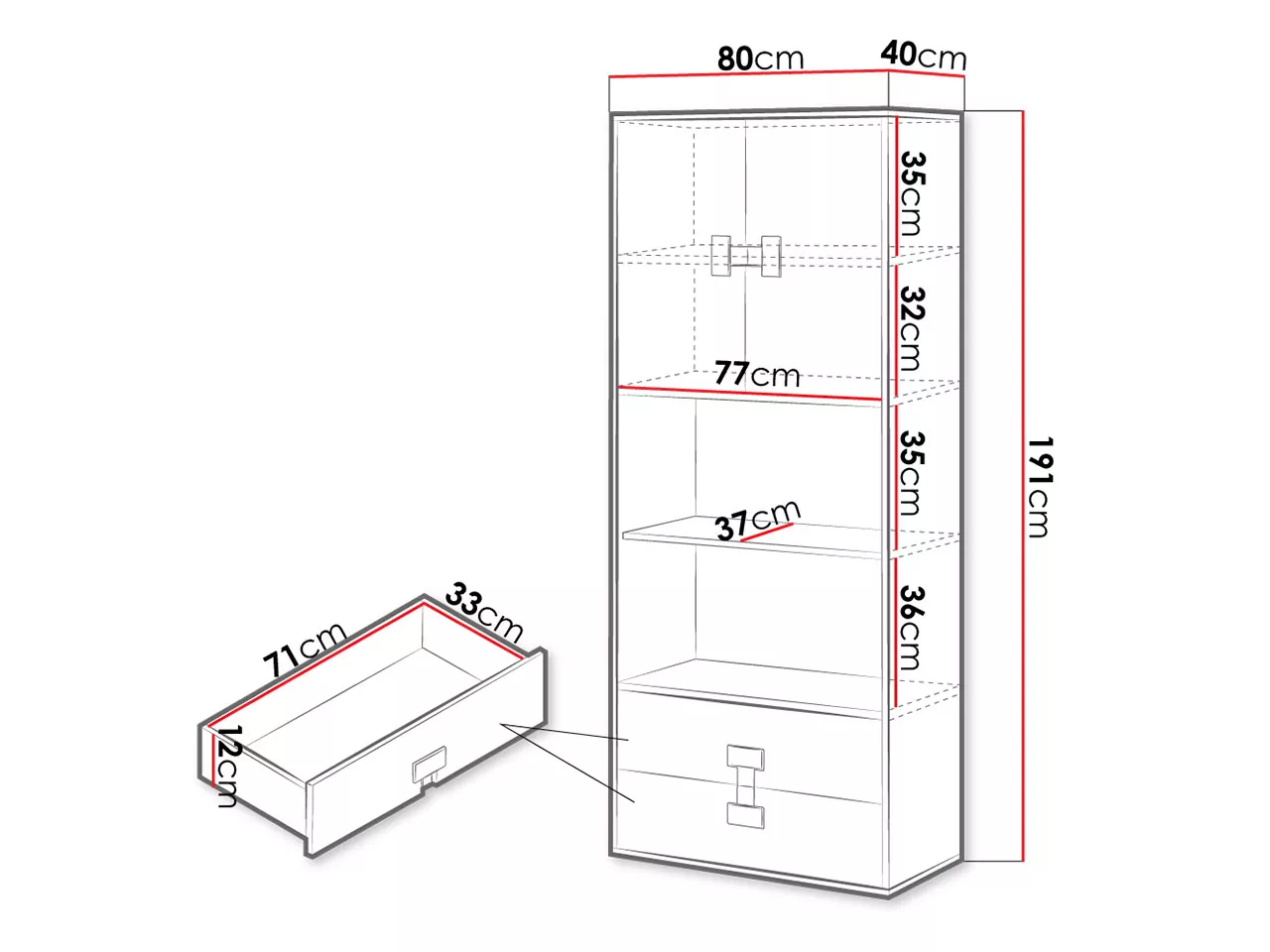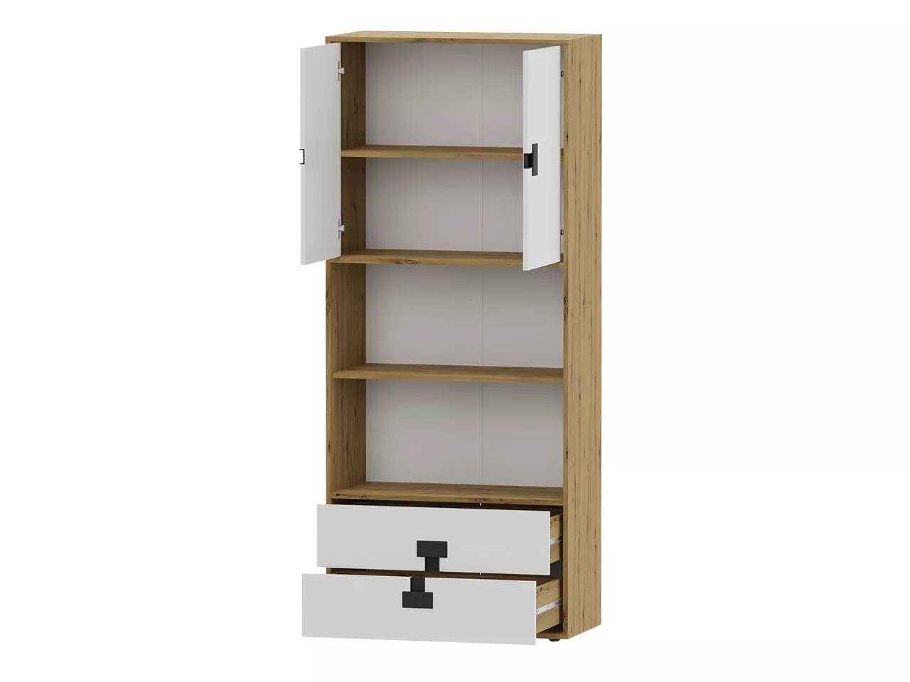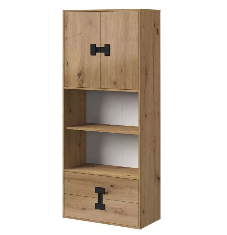 Vysoký regál BASHIRA 2 je vysoce funkčním řešením, které poskytuje dostatek úložného prostoru. Otevřené police jsou ideálním místem pro vystavení dekorací, zatímco uzavřená skříňka a šuplíky slouží k úschově studijního materiálu či oblečení.