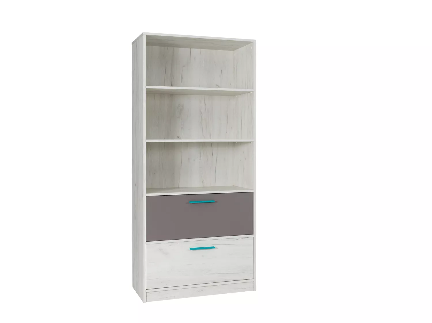 Vysoký regál se šuplíky DEANY - dub kraft / popelavý / tyrkysový