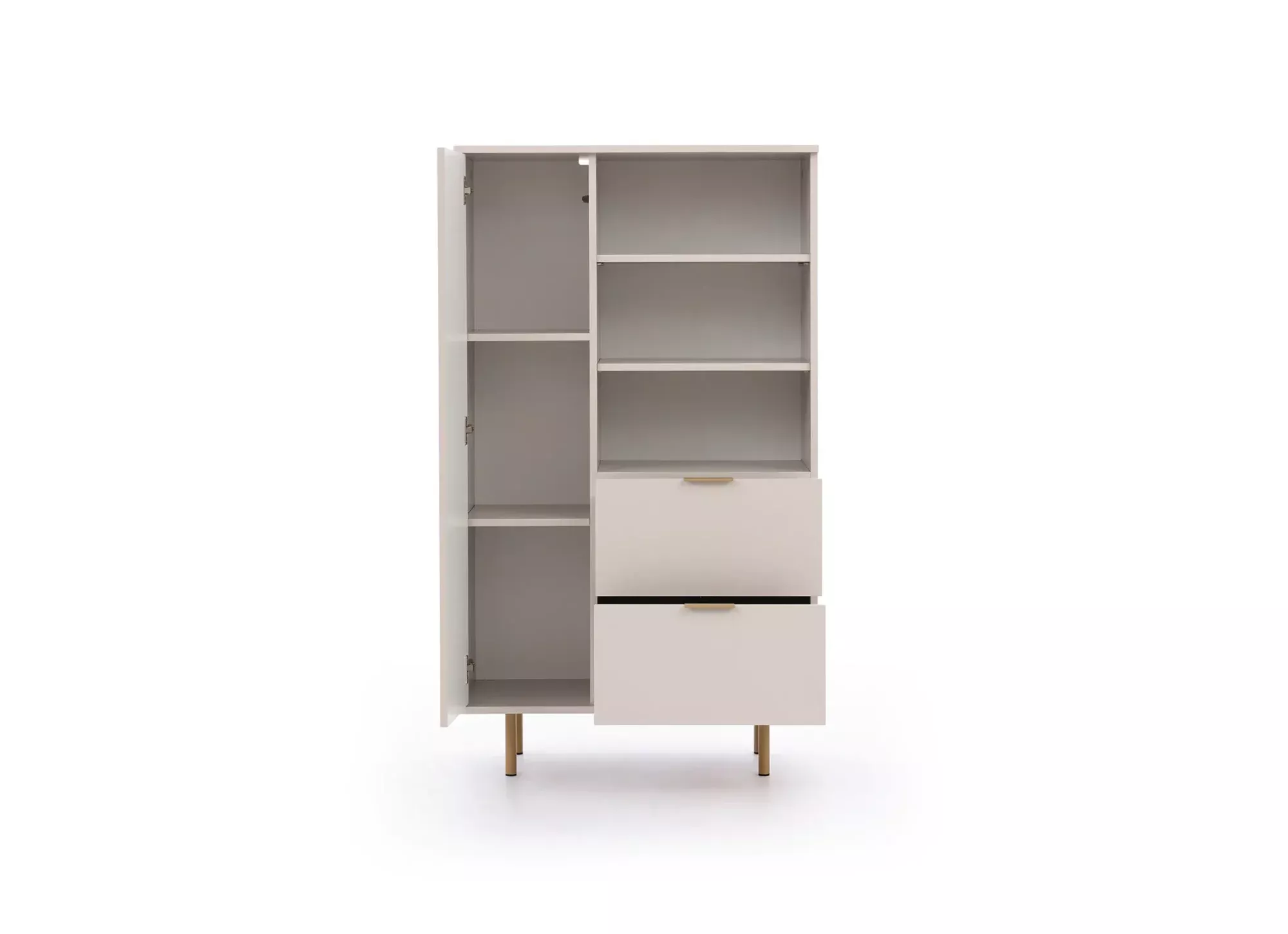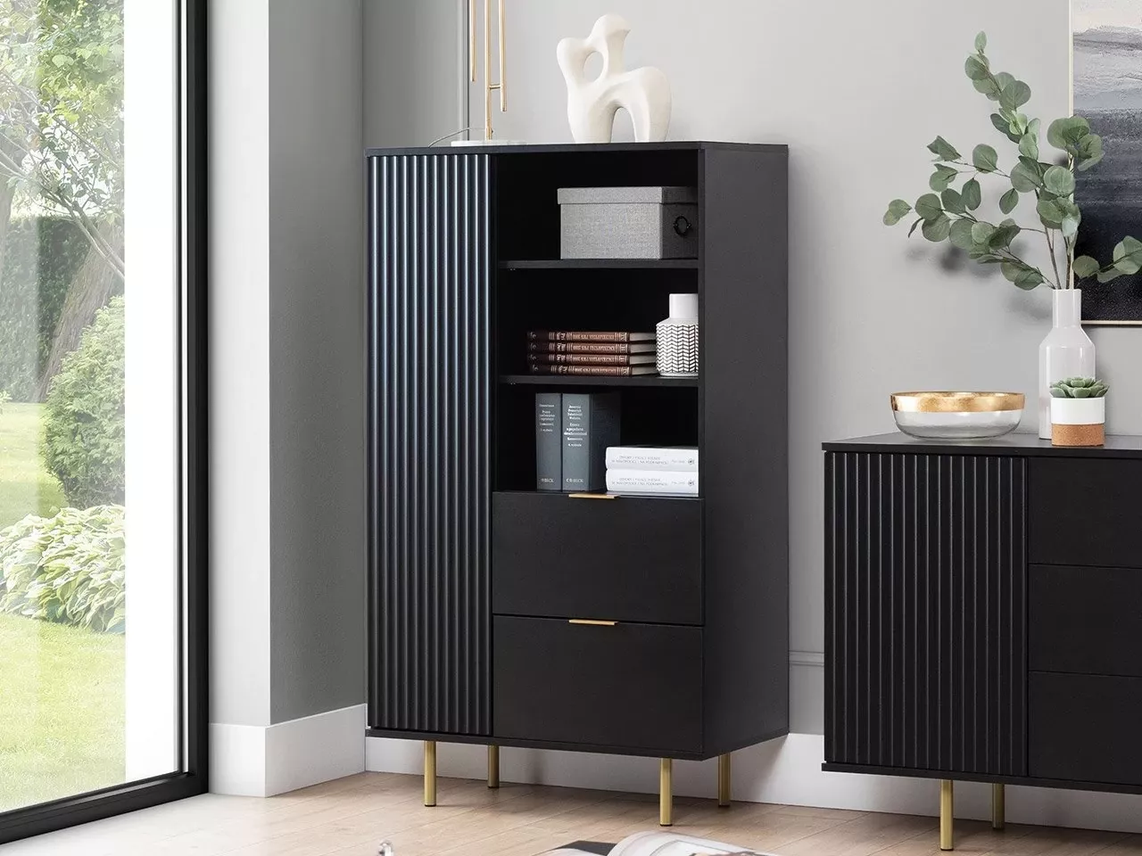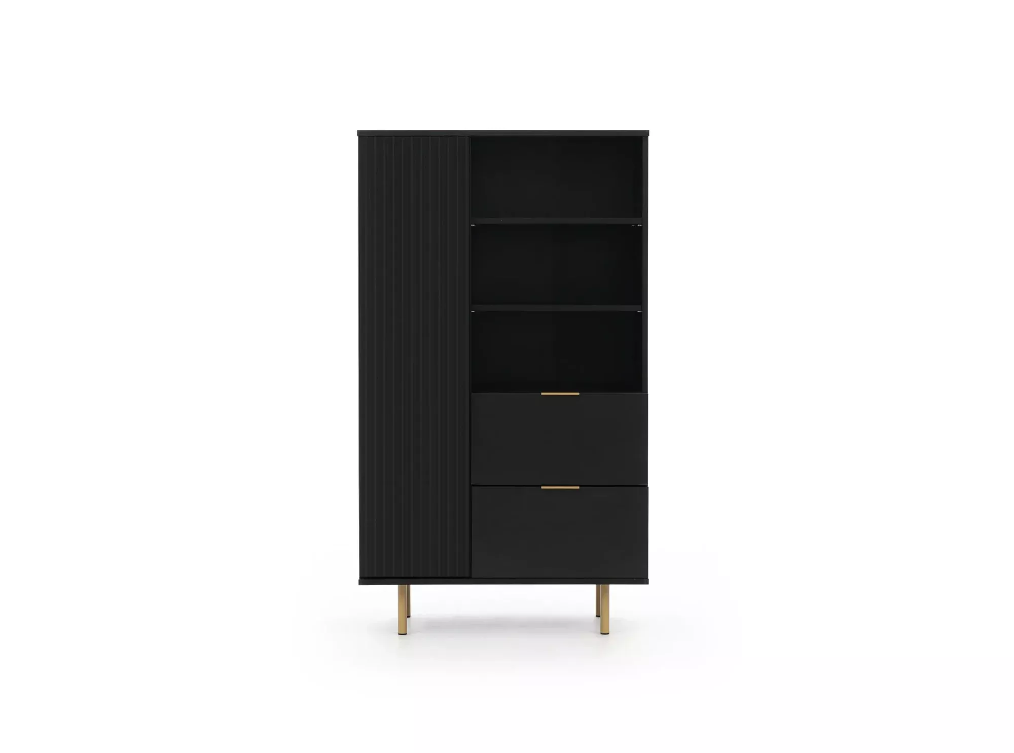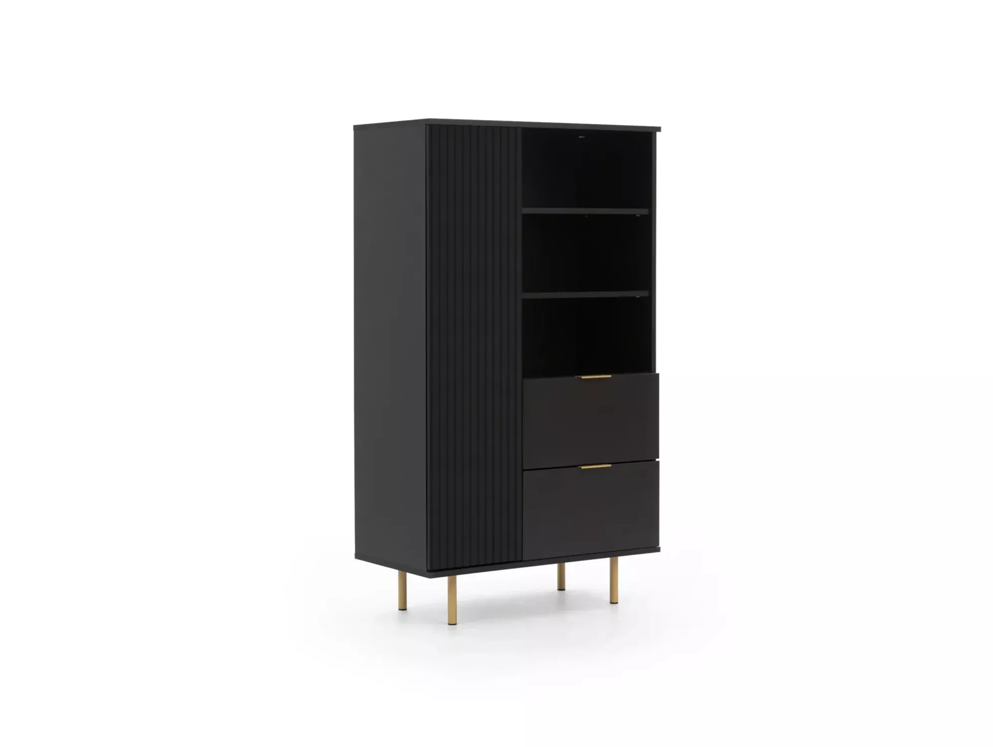 Regál se šuplíky STELLA poskytne úložný prostor a další místo pro vystavení vašich oblíbených dekorací a suvenýrů. Díky svému designu v podobě frézovaných dvířek a vysokých zlatých nohou dodá místnosti eleganci a charakter.