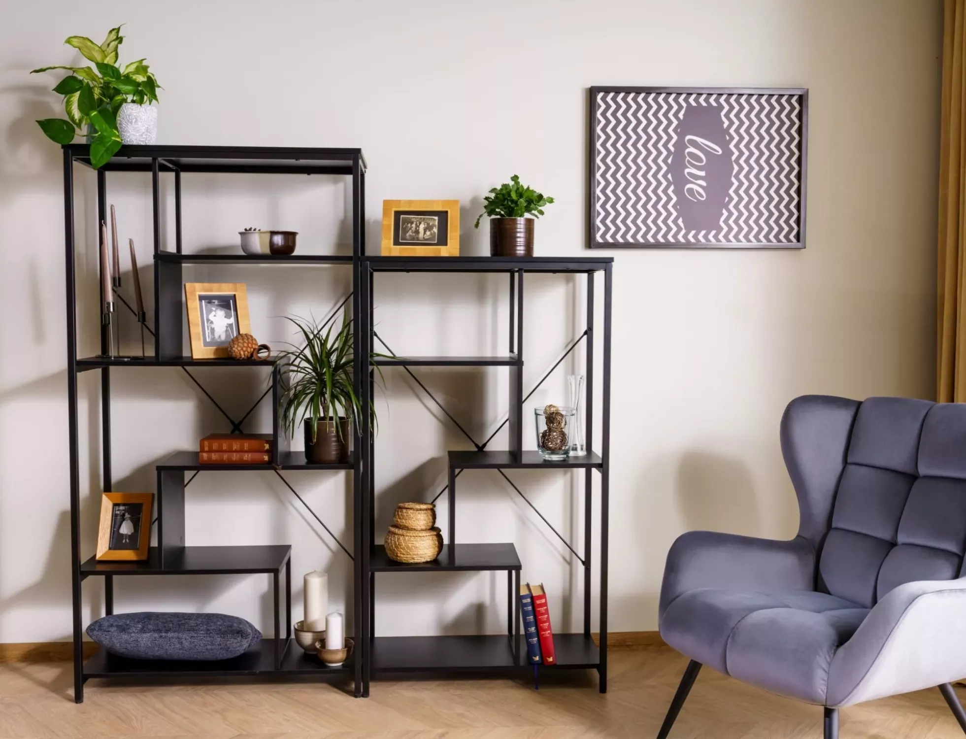 Policový regál ESTEFANI 1 je nevšední doplněk do interiéru, který umožní uspořádat knihy, dekorace a další druhy předmětů podle vašich představ.