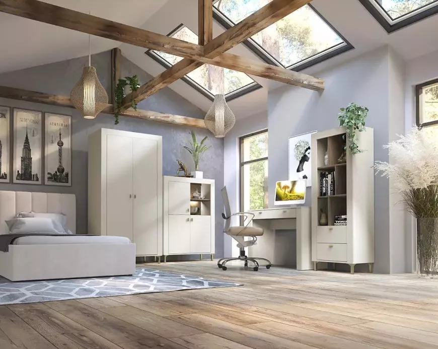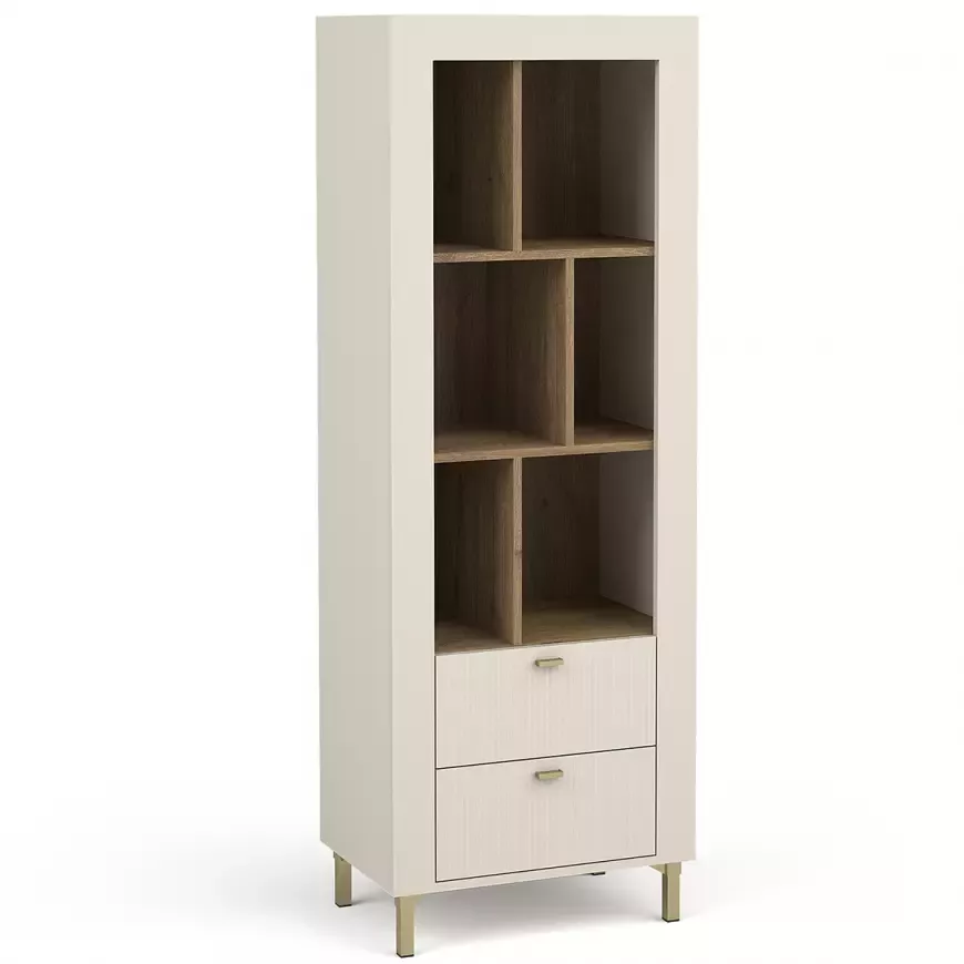 Úzký regál se šuplíky AUROVA - kašmír / dub whiskey