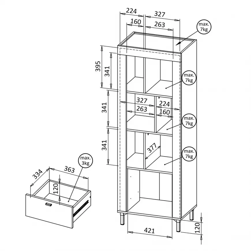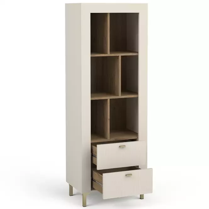Úzký regál se šuplíky AUROVA disponuje otevřenými policemi, které umožňují vystavení dekorací, fotografií nebo suvenýrů. Díky 2 prostorným šuplíkům schováte dokumenty nebo ubrusy.