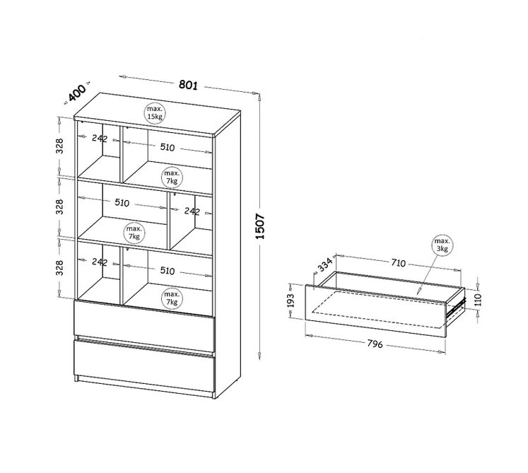 Vysoký regál se šuplíky CARYM se díky svému minimalistickému provedení hodí do každého interiéru. Regál disponuje 2 prostornými šuplíky a 6 otevřenými přihrádkami. Bezúchytkové provedení zpříjemní každodenní používání a podtrhne moderní design.
