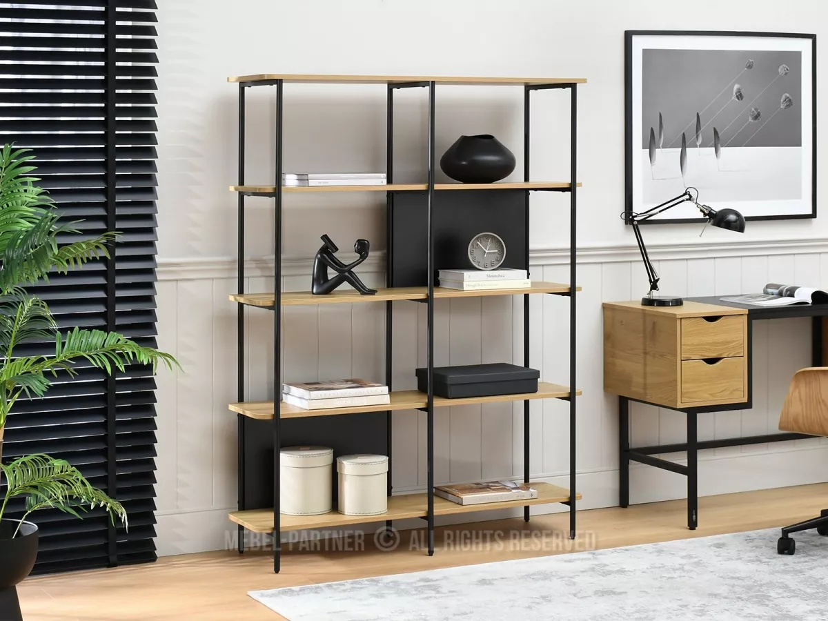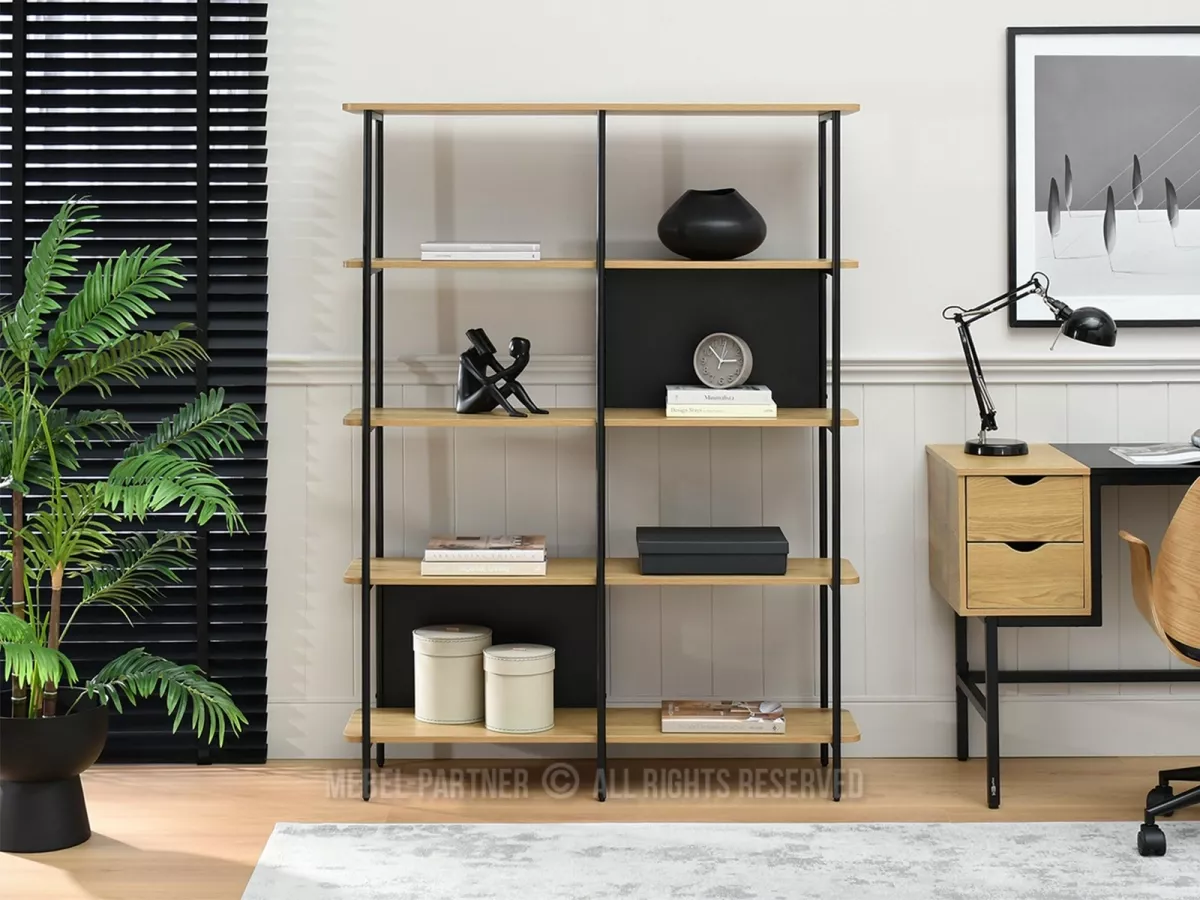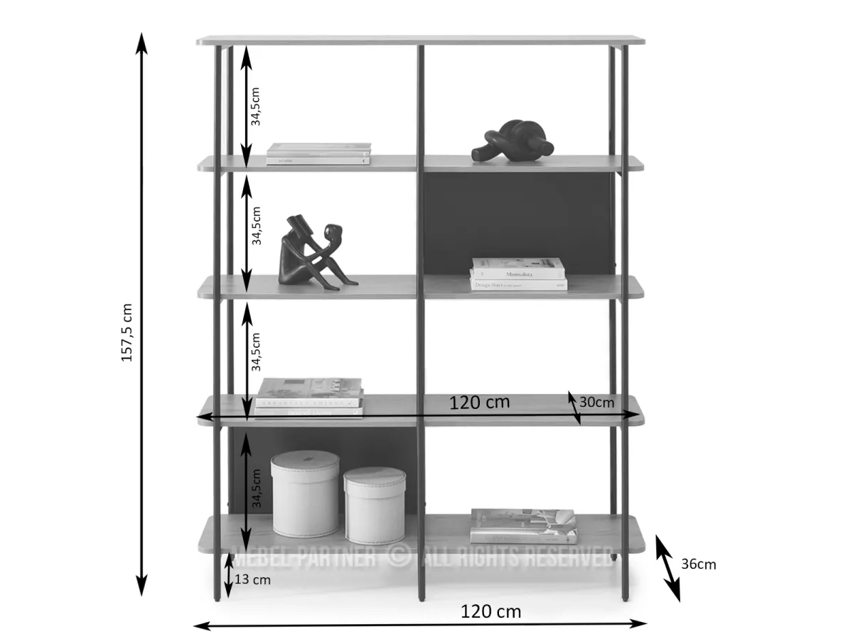 Široký policový regál ELEMER svým zpracováním zapadne do všech industriálních, loftových a moderních interiérů. Disponuje 4 praktickými policemi pro vystavení dekorací, knih nebo fotografií.