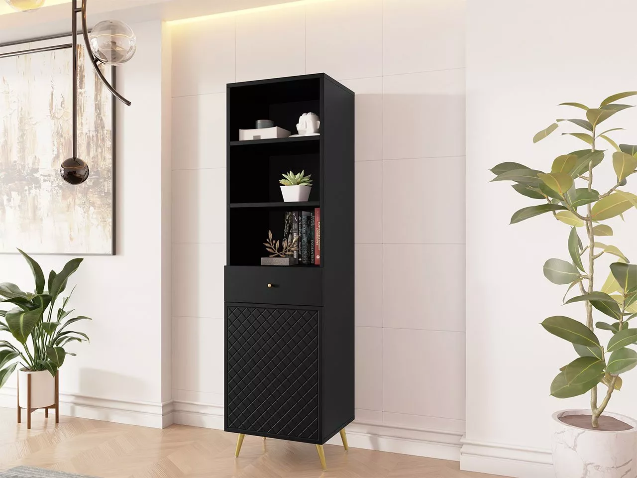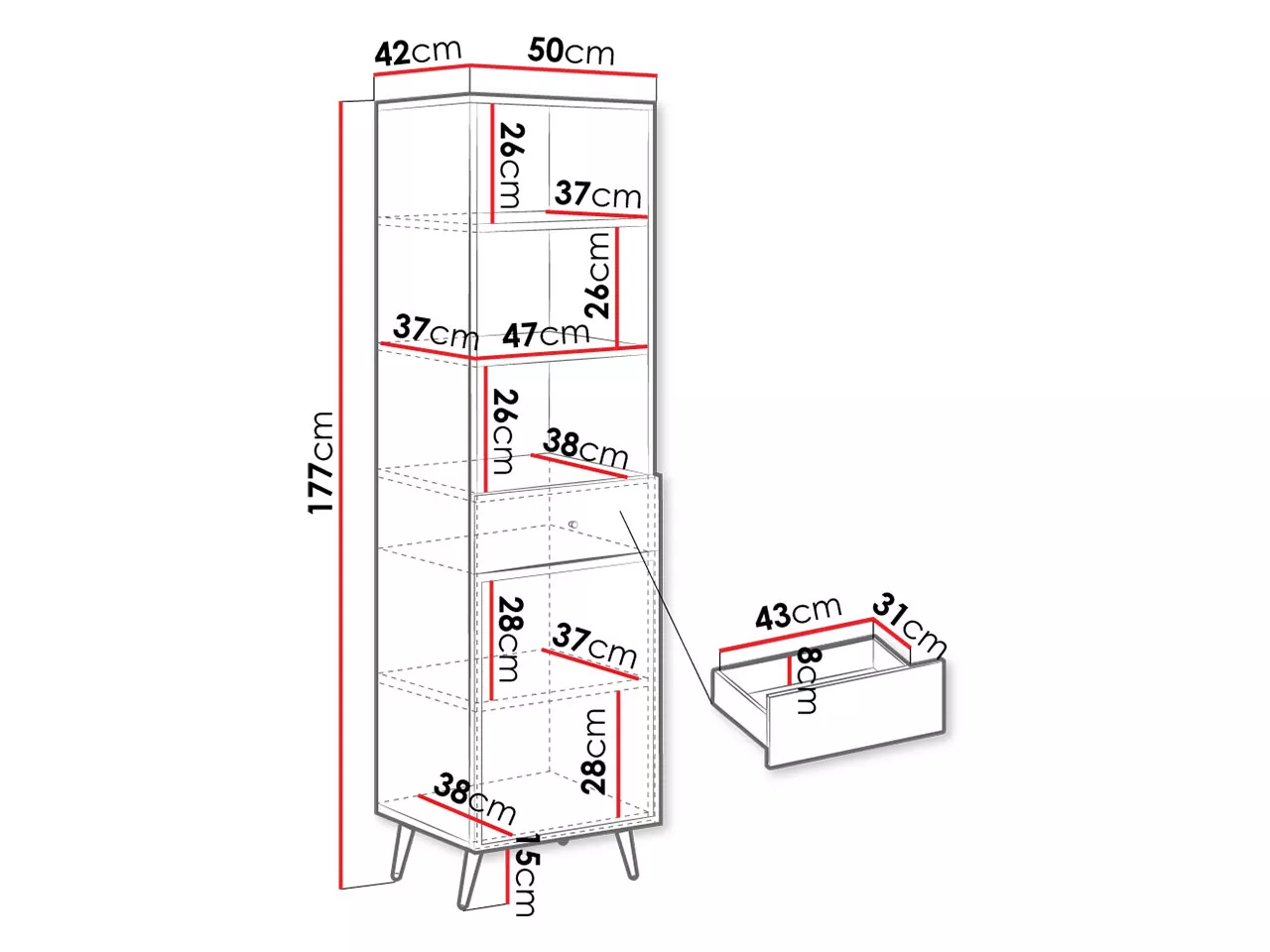 Úzký regál PINELAND je praktickým pomocníkem do vaší domácnosti. Otevřené police vám umožní vystavit různé dekorace, zatímco šuplík a uzavřená skříňka vám pomohou uschovat důležité dokumenty. Za zmínku určitě stojí i jedinečný vzhled regálu, který dodá interiéru punc elegance a jedinečného stylu.