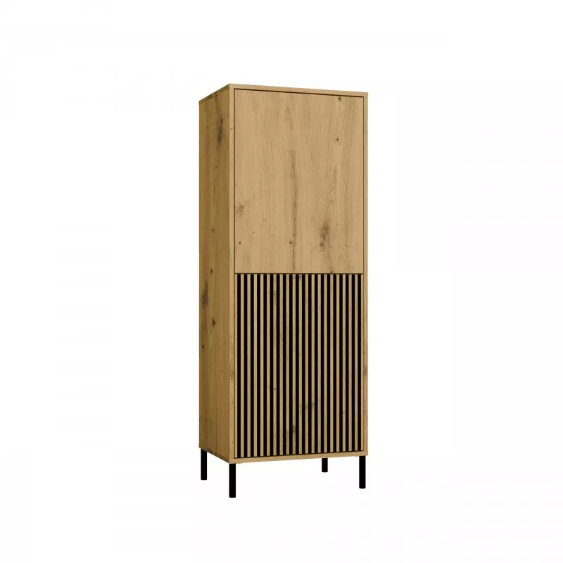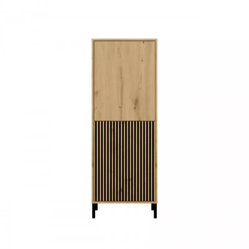 Dvoudveřová policová skříň ELBA se perfektně hodí do obývacího pokoje, pokoje pro hosty, ložnice nebo kanceláře. Kombinace dvířek s hladkým čelem a dvířek s drážkovaným čelem připomínajícím lamely dodává komodě specifický design. Systém TIP-ON umožňuje pohodlné používání bez úchytek.
