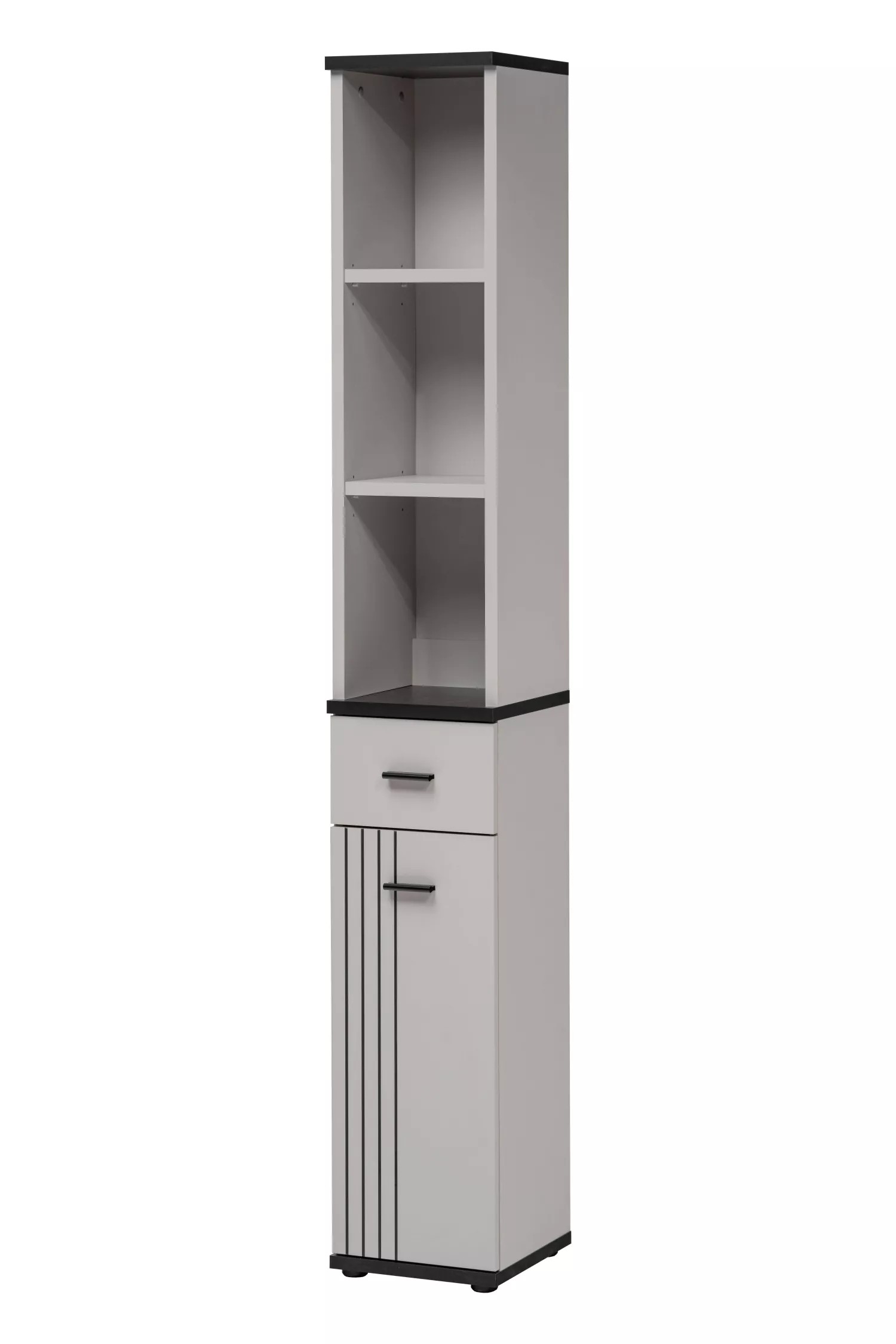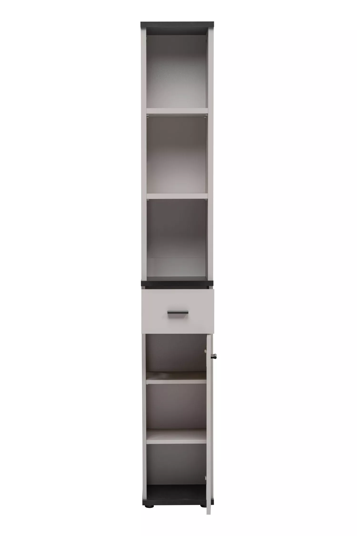 Vysoká skříňka PETUNIA se šuplíkem vnese do interiéru moderní vzhled a nadčasovou eleganci. Police, uzavíratelná skříňka a šuplík nabízí praktický úložný prostor.