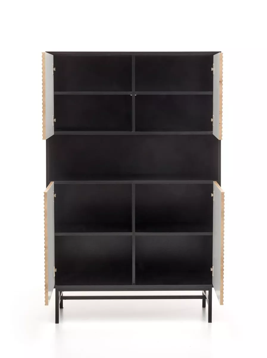 Čtyřdvéřová skříň 100 cm FAHIM s otevřenými policemi je elegantní a prostorný kus nábytku. Nabízí praktický prostor pro uložení a vystavení knih, dekorací nebo doplňků.