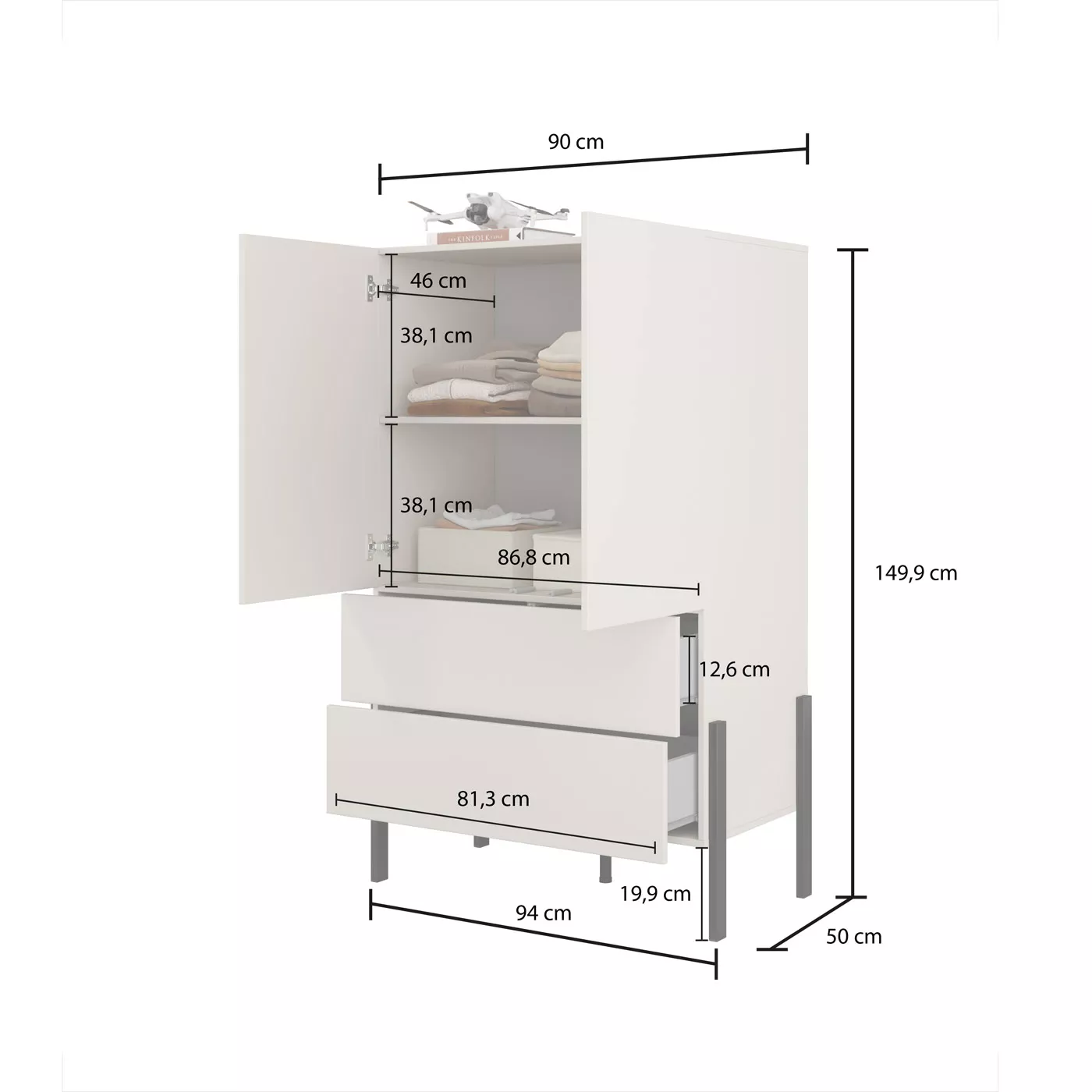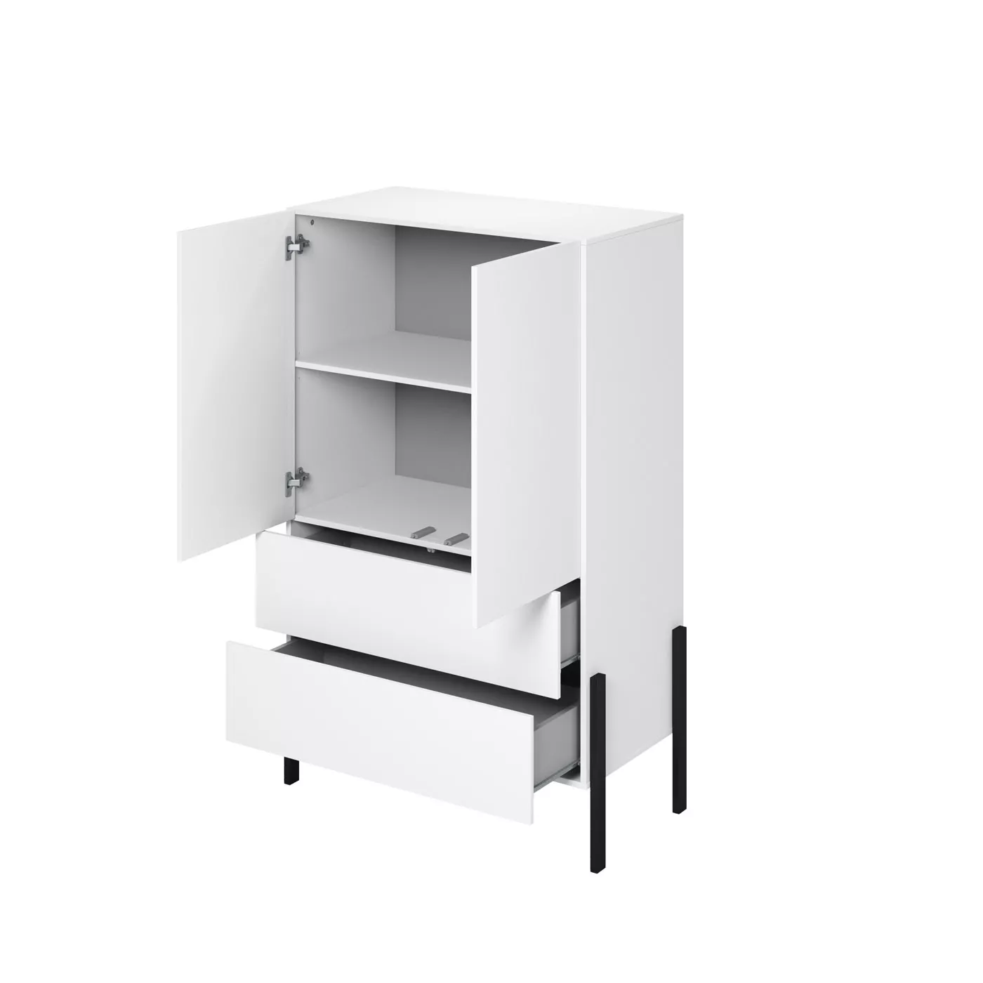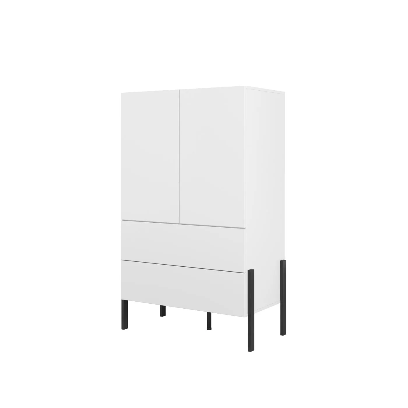 Nízká skříň 94 cm ADIS se šuplíky na první pohled zaujme svými vysokými kovovými nožkami. Disponuje velkým množstvím úložného prostoru pro uložení oblečení nebo doplňků. Skříň je vybavená systémem otevírání push to open, což zpříjemní její každodenní používání.