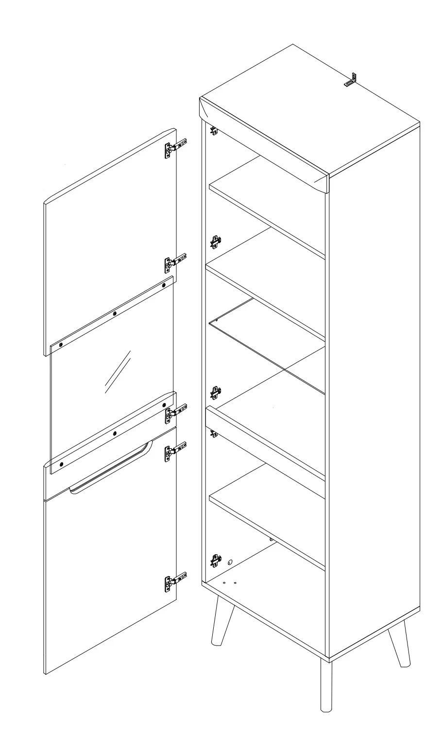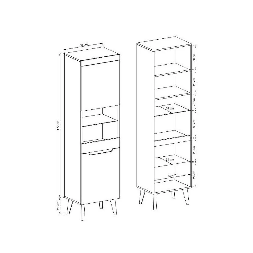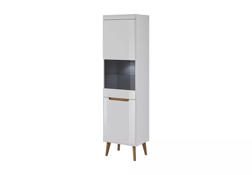 Úzká vitrína s horními prosklenými dvířky a skleněnou policí je spojením krásy a funkčnosti. Poskytuje optimální množství úložného prostoru pro vaše oblíbené