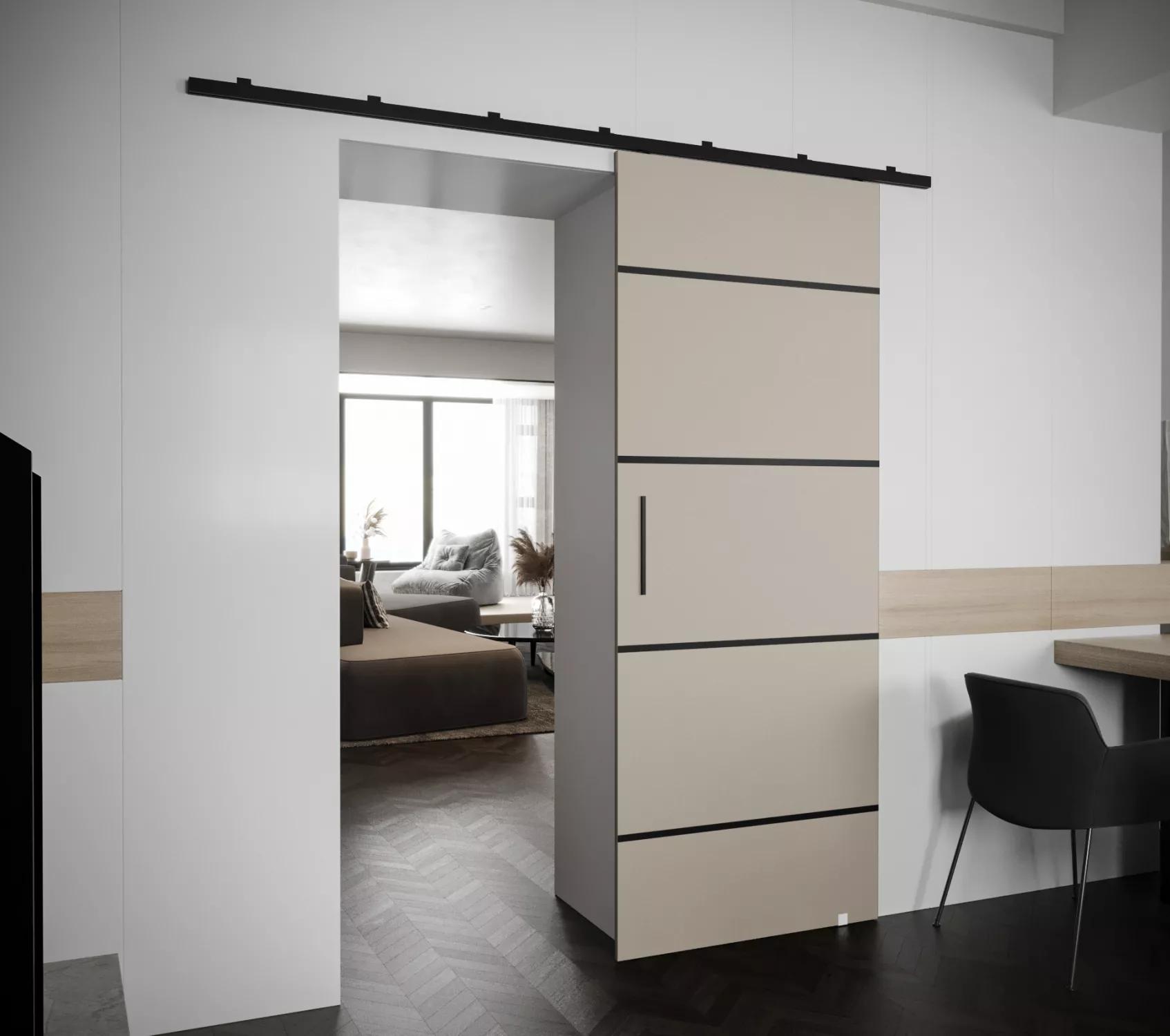 Posuvné dveře PERDITA nejsou časově náročné na instalaci. Skvělé se hodí do malých bytů, kde je velmi důležité zachovat co nejvíce prostoru. Kvalitu zpracování podtrhuje kovový pojezdový systém.