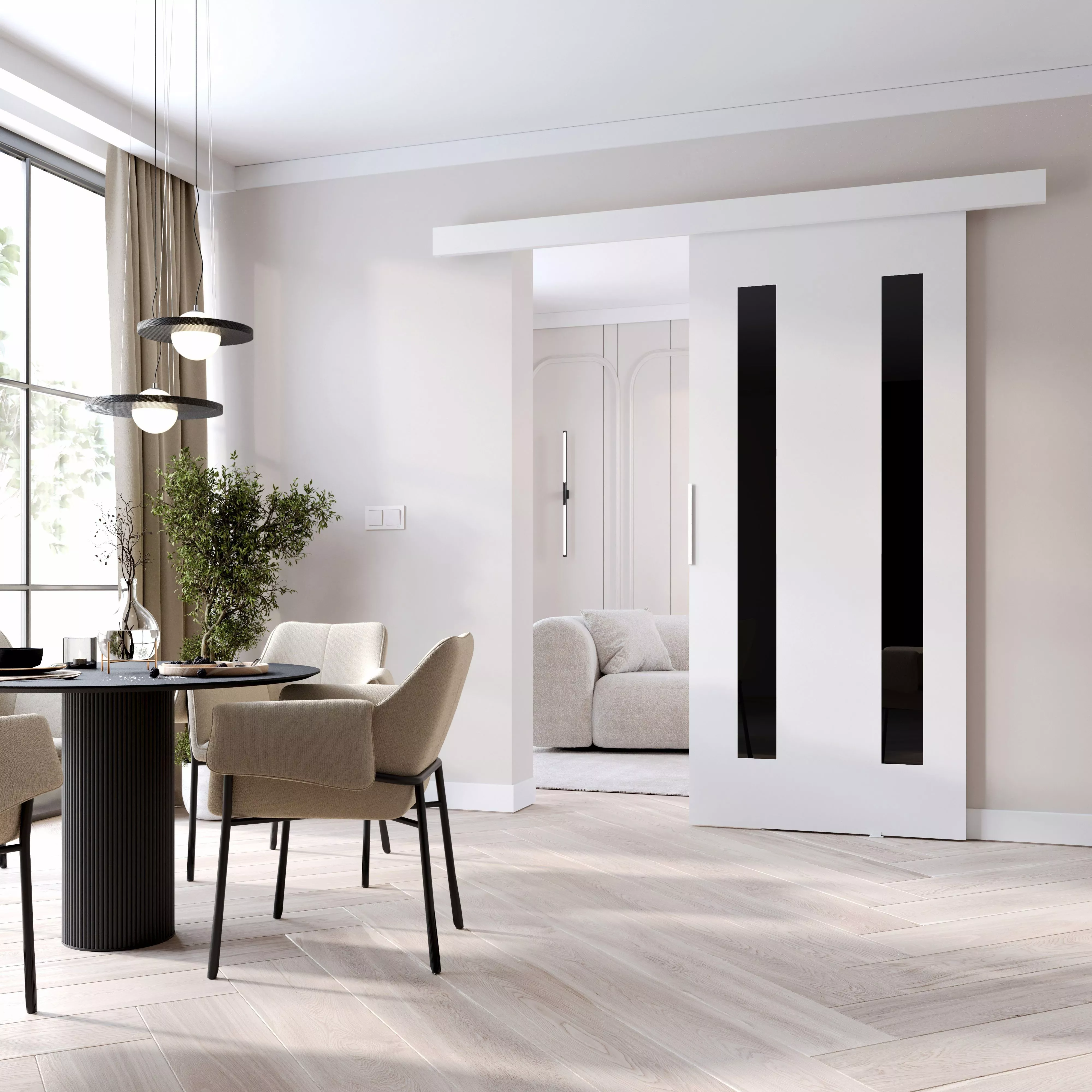 Posuvné dveře BARRET 8 ocení majitelé prostorných interiérů, kde se takové řešení používá k rozdělení místnosti, například oddělení jídelny od obývacího pokoje, které lze po odsunutí dveří opět spojit do otevřeného prostoru. Posuvné dveře zaručují tichý a lehký pohyb. Dveře zdobí dekorativní prvky z černého skla.