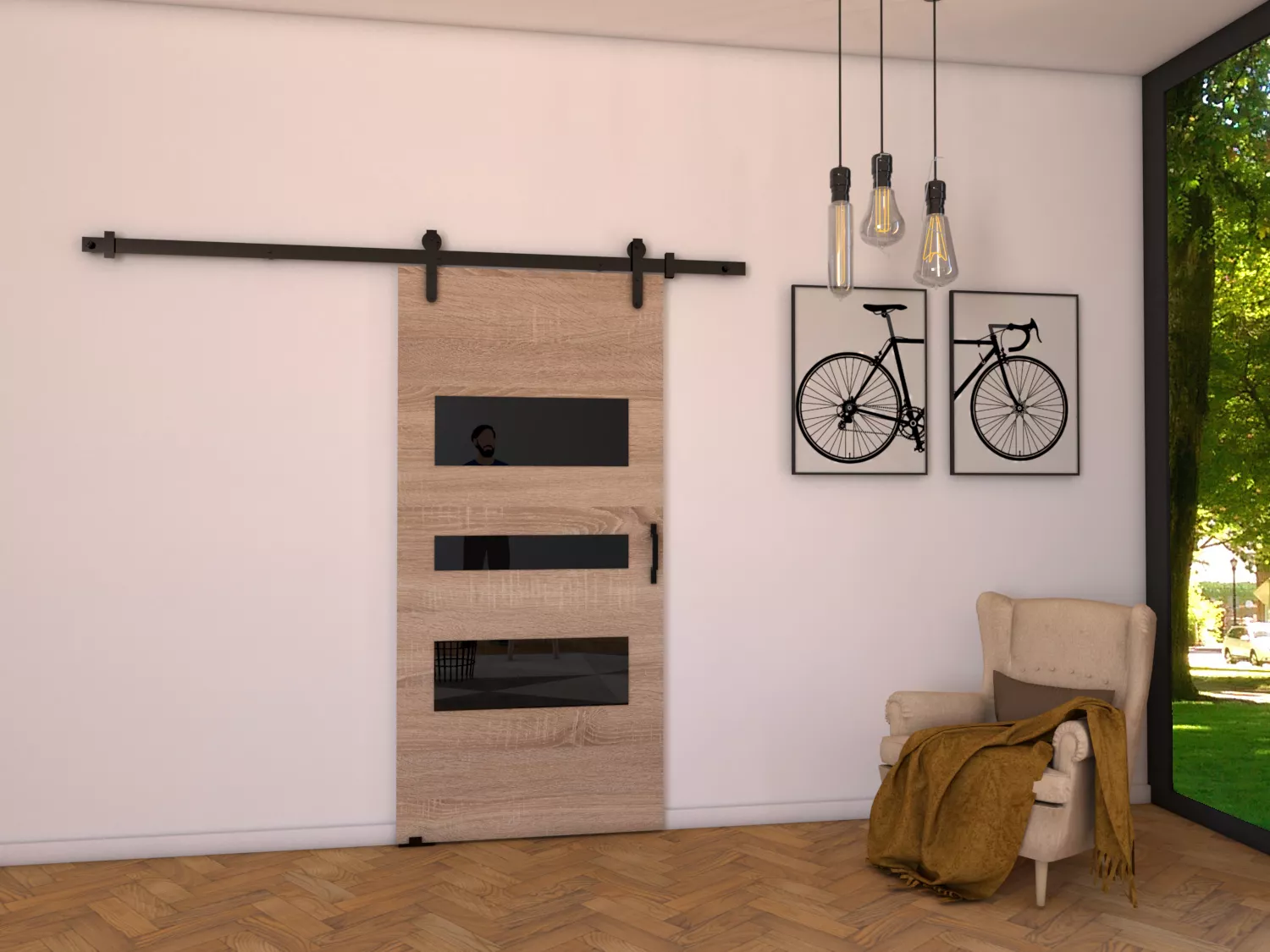 Interiérové dveře na stěnu BUSHLAND 3 jsou skvělou volbou pro ty, kdo chtějí vytvořit otevřený a propojený prostor. Dveře jsou perfektním řešením pro úsporu místa. Dveře zdobí lepené dekorativní prvky z černého skla.