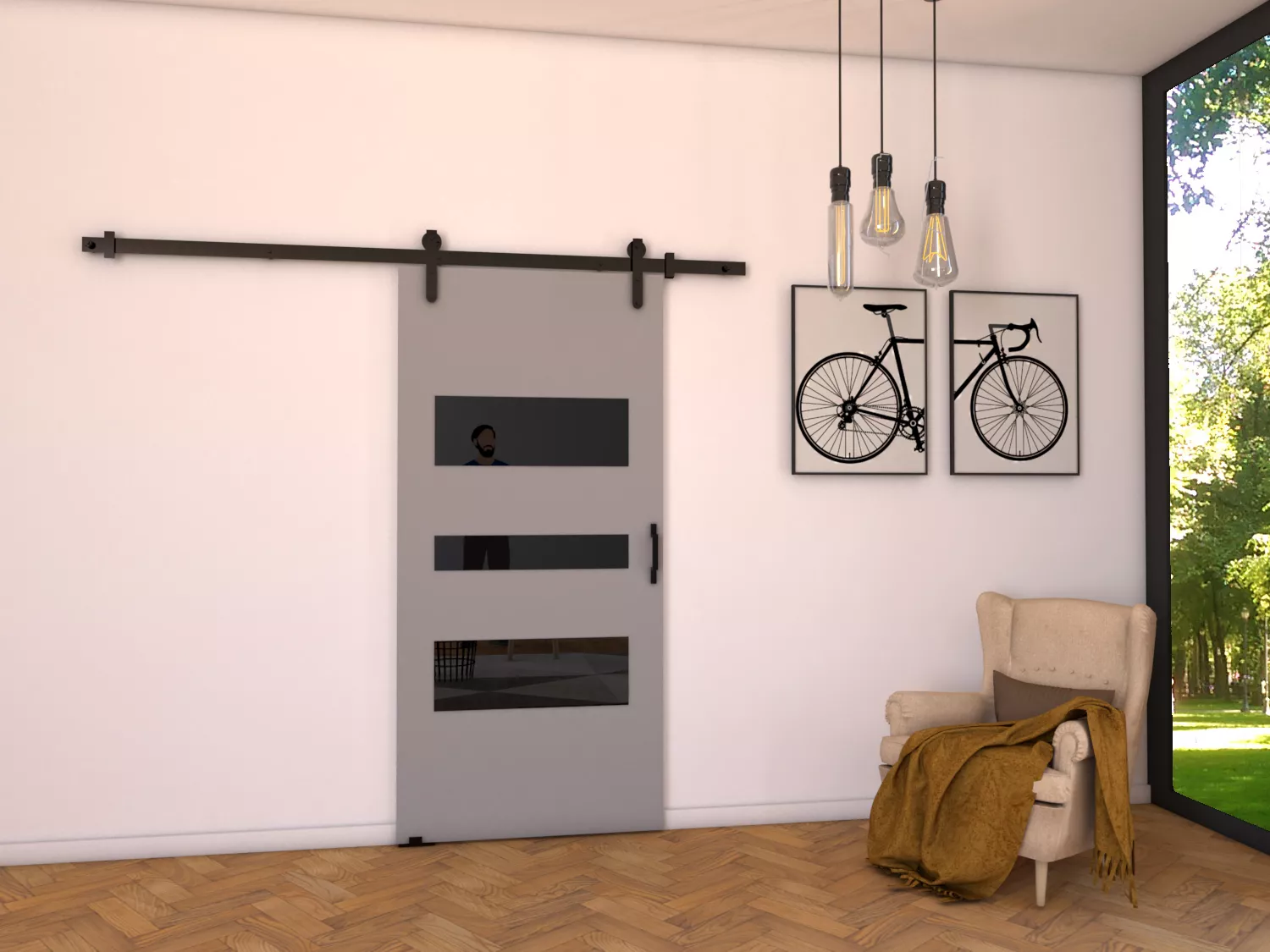 Interiérové dveře na stěnu BUSHLAND 3 jsou skvělou volbou pro ty, kdo chtějí vytvořit otevřený a propojený prostor. Dveře jsou perfektním řešením pro úsporu místa. Dveře zdobí lepené dekorativní prvky z černého skla.