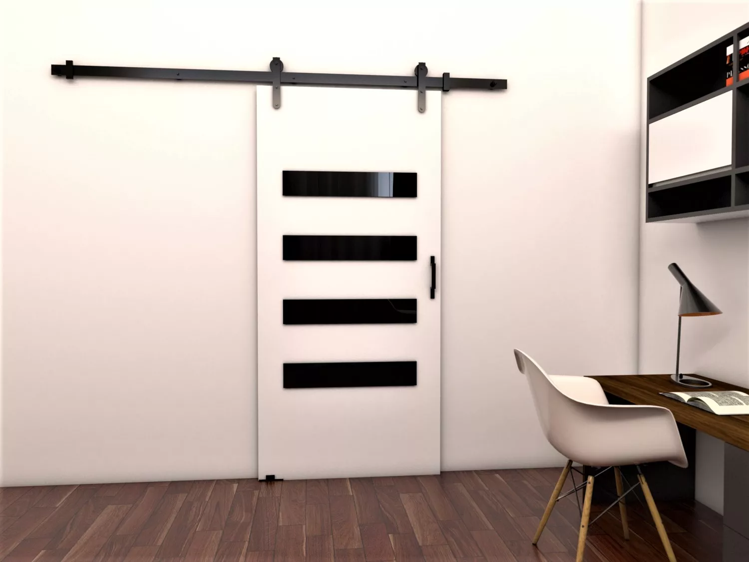 Posuvné interiérové dveře BUSHLAND 6 se pyšní loftovým designem a jsou perfektním řešením pro úsporu místa. Můžete je využít jako klasický vchod do další místnosti, nebo do speciálně vytvořené šatny. Dveře zdobí lepené dekorativní prvky z černého skla.