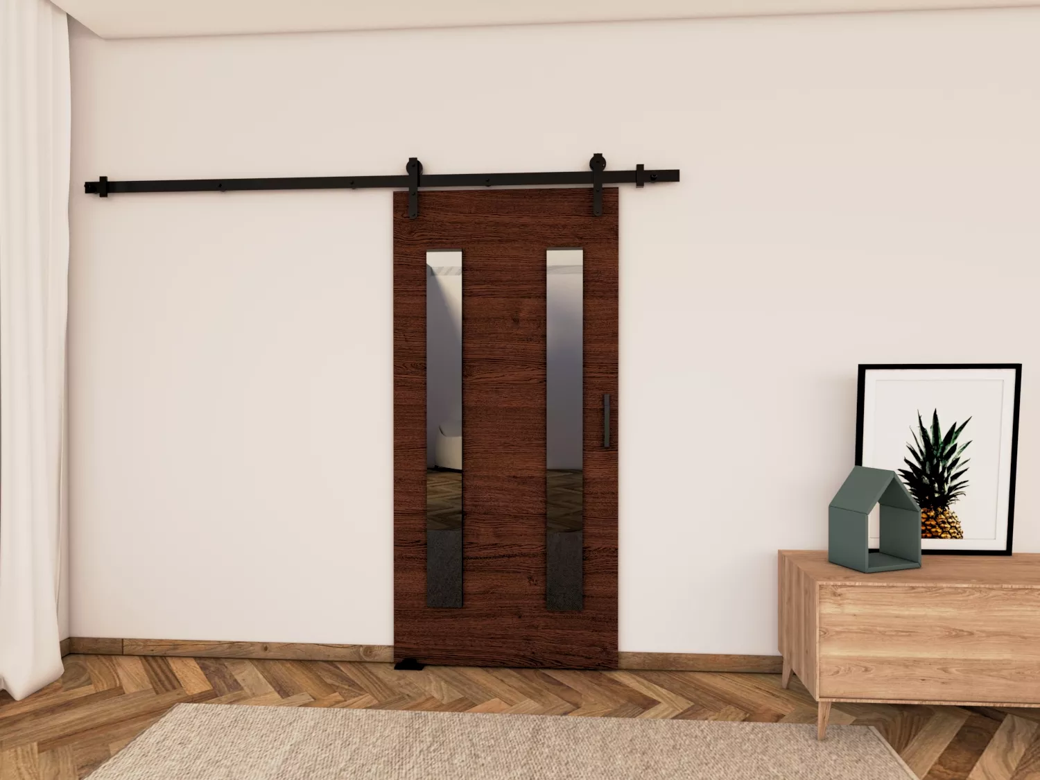 Posuvné dveře v loftovém stylu BUSHLAND 8 zajišťují soukromí bez časově náročné instalace. Dveře zdobí lepené dekorativní prvky z černého skla. Použitý posuvný systém zaručuje tichý chod a bezporuchový provoz po mnoho let.