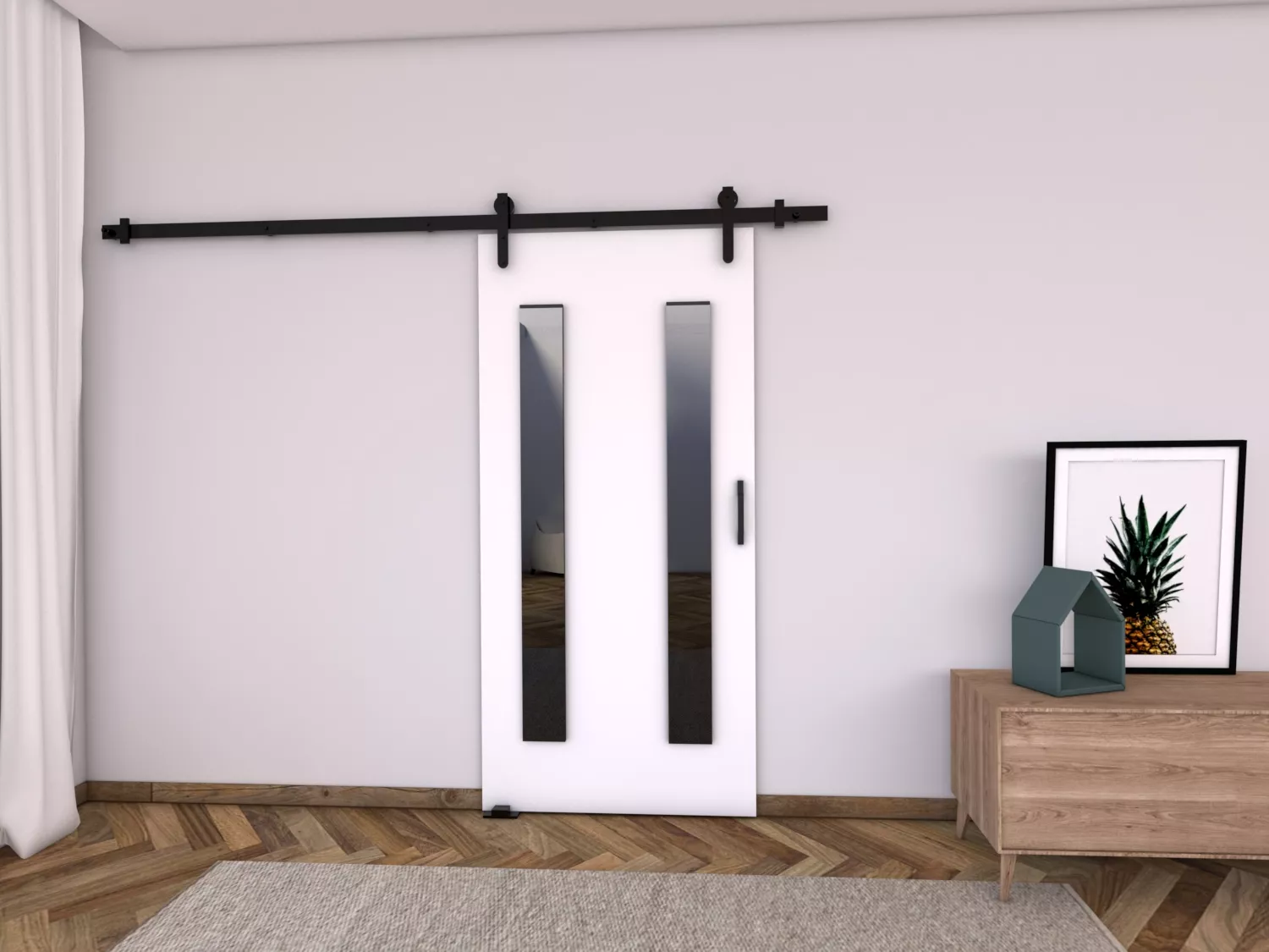 Posuvné dveře v loftovém stylu BUSHLAND 8 zajišťují soukromí bez časově náročné instalace. Dveře zdobí lepené dekorativní prvky z černého skla. Použitý posuvný systém zaručuje tichý chod a bezporuchový provoz po mnoho let.