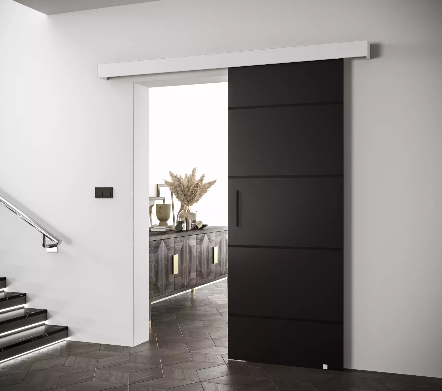Posuvné dveře s černým úchytem SALOME 4 jsou vyrobeny z LTD desky, hrany jsou pečlivě zakončeny odolnou PVC dýhou. Hliníkový pojezdový systém zakrývá krycí lišta, která je součástí balení.