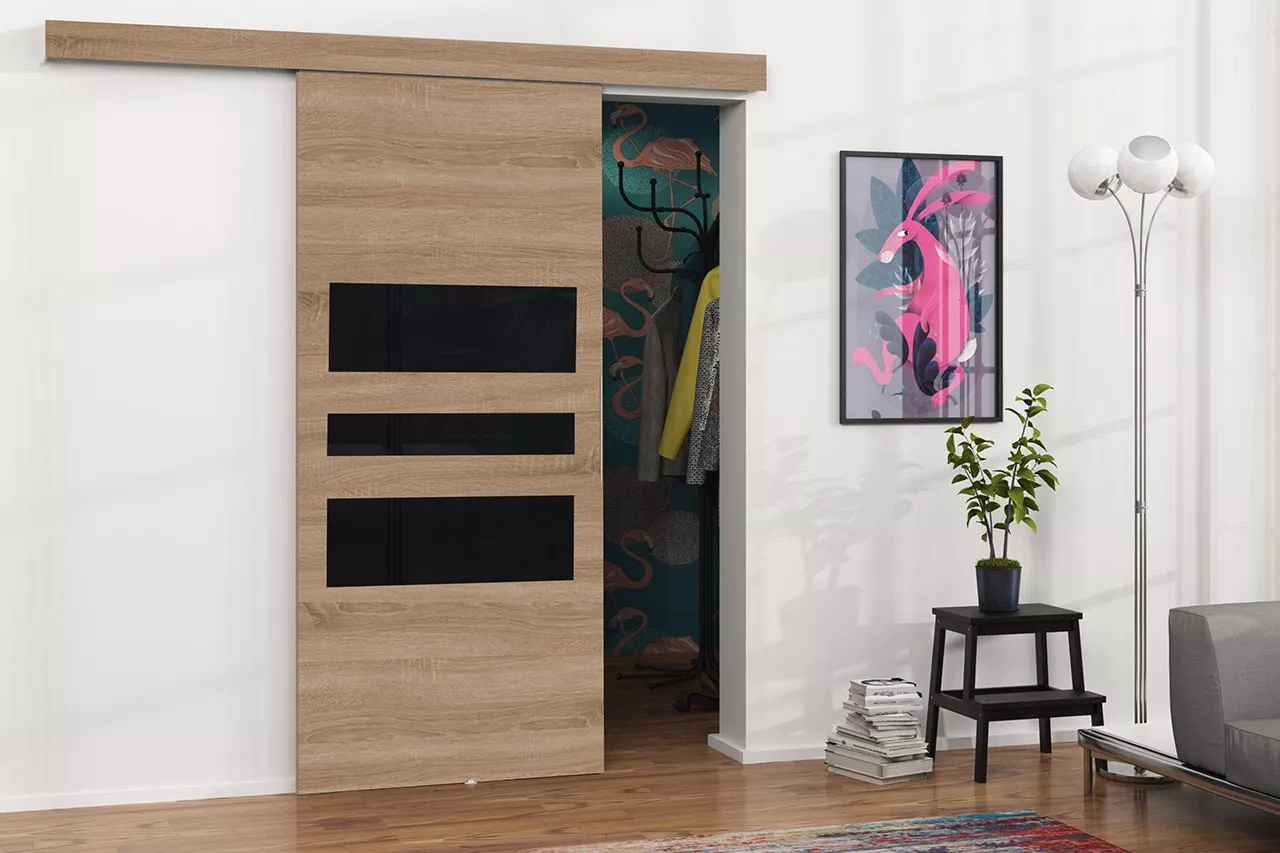 Posuvné interiérové dveře VIGRA 3 zajišťují soukromí bez časově náročné instalace. Dveře lze využít jako oddělení 2 místností nebo jako dveře do skříně či šatny. Dveře jsou zdobeny dekorativními černými skleněnými vložkami.