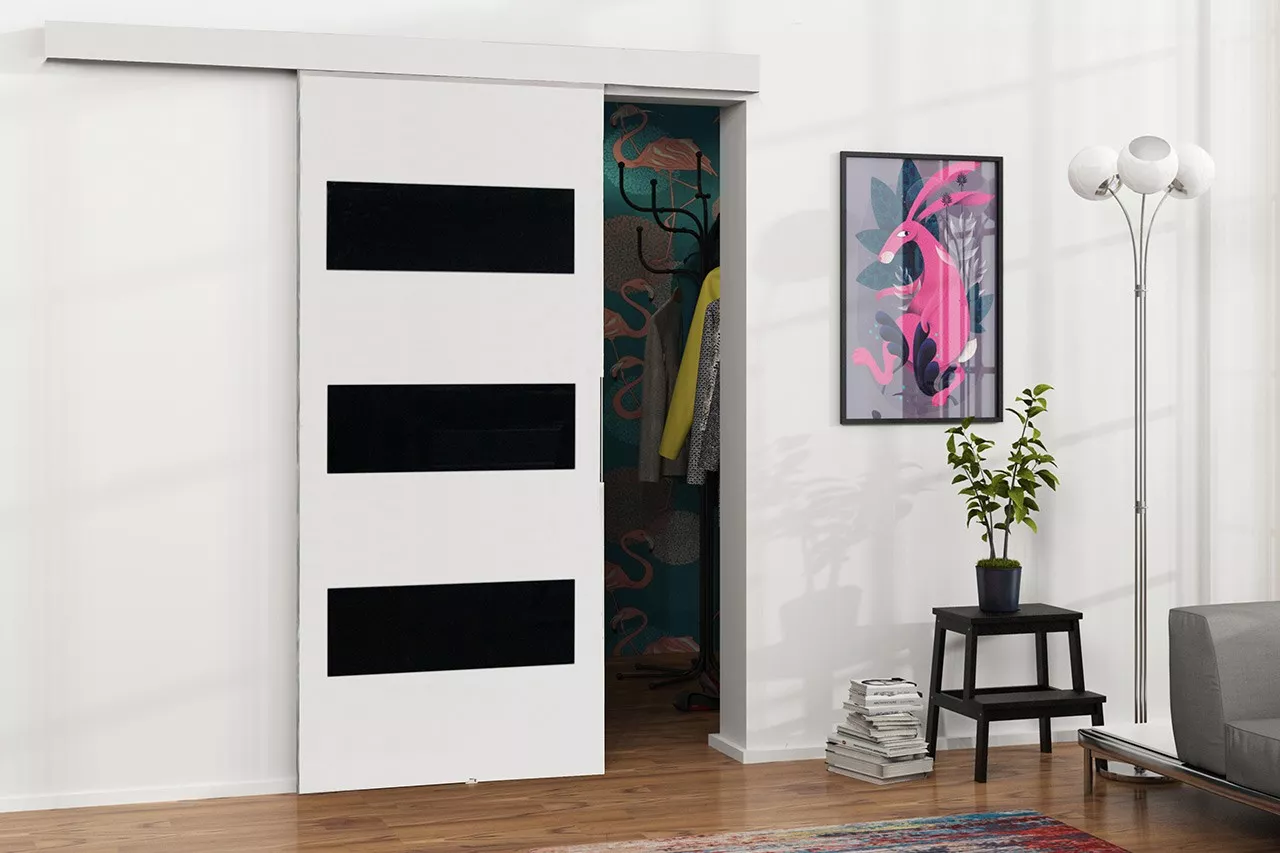 Posuvné interiérové dveře VIGRA 4 jsou vyrobeny z vysoce kvalitních materiálů zaručujících bezchybný vzhled a dokonalé odhlučnění interiéru. Jsou také vybaveny samozavíračem, který zabraňuje bouchání při zavírání. Dveře jsou zdobeny dekorativními černými skleněnými vložkami.