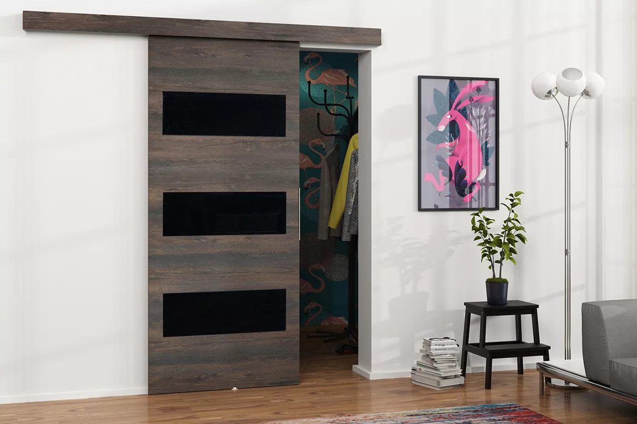 Posuvné interiérové dveře VIGRA 4 jsou vyrobeny z vysoce kvalitních materiálů zaručujících bezchybný vzhled a dokonalé odhlučnění interiéru. Jsou také vybaveny samozavíračem, který zabraňuje bouchání při zavírání. Dveře jsou zdobeny dekorativními černými skleněnými vložkami.