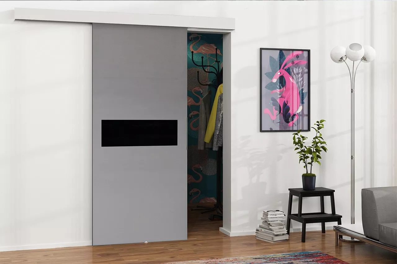 Posuvné interiérové dveře VIGRA 6 zajišťují soukromí bez časově náročné instalace. Jsou vybaveny samozavíračem, který zabraňuje bouchání při zavírání. Dveře jsou zdobeny dekorativními černými skleněnými vložkami.