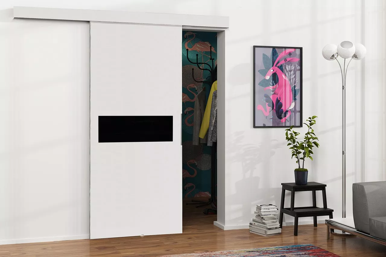 Posuvné interiérové dveře VIGRA 6 zajišťují soukromí bez časově náročné instalace. Jsou vybaveny samozavíračem, který zabraňuje bouchání při zavírání. Dveře jsou zdobeny dekorativními černými skleněnými vložkami.