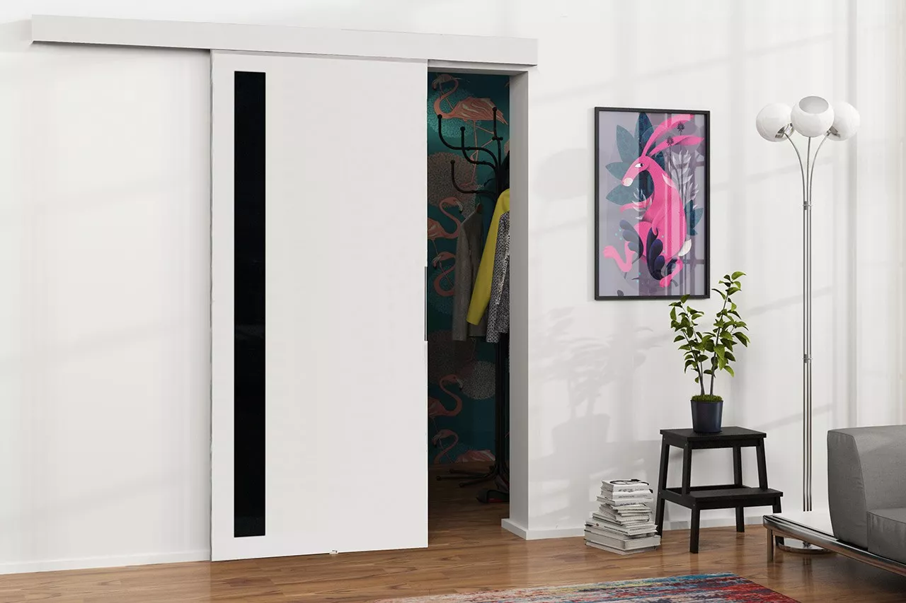 Posuvné interiérové dveře VIGRA 7 zajišťují soukromí bez časově náročné instalace. Dveře lze využít jako oddělení 2 místností nebo jako dveře do skříně či šatny. Dveře jsou zdobeny dekorativními černými skleněnými vložkami.