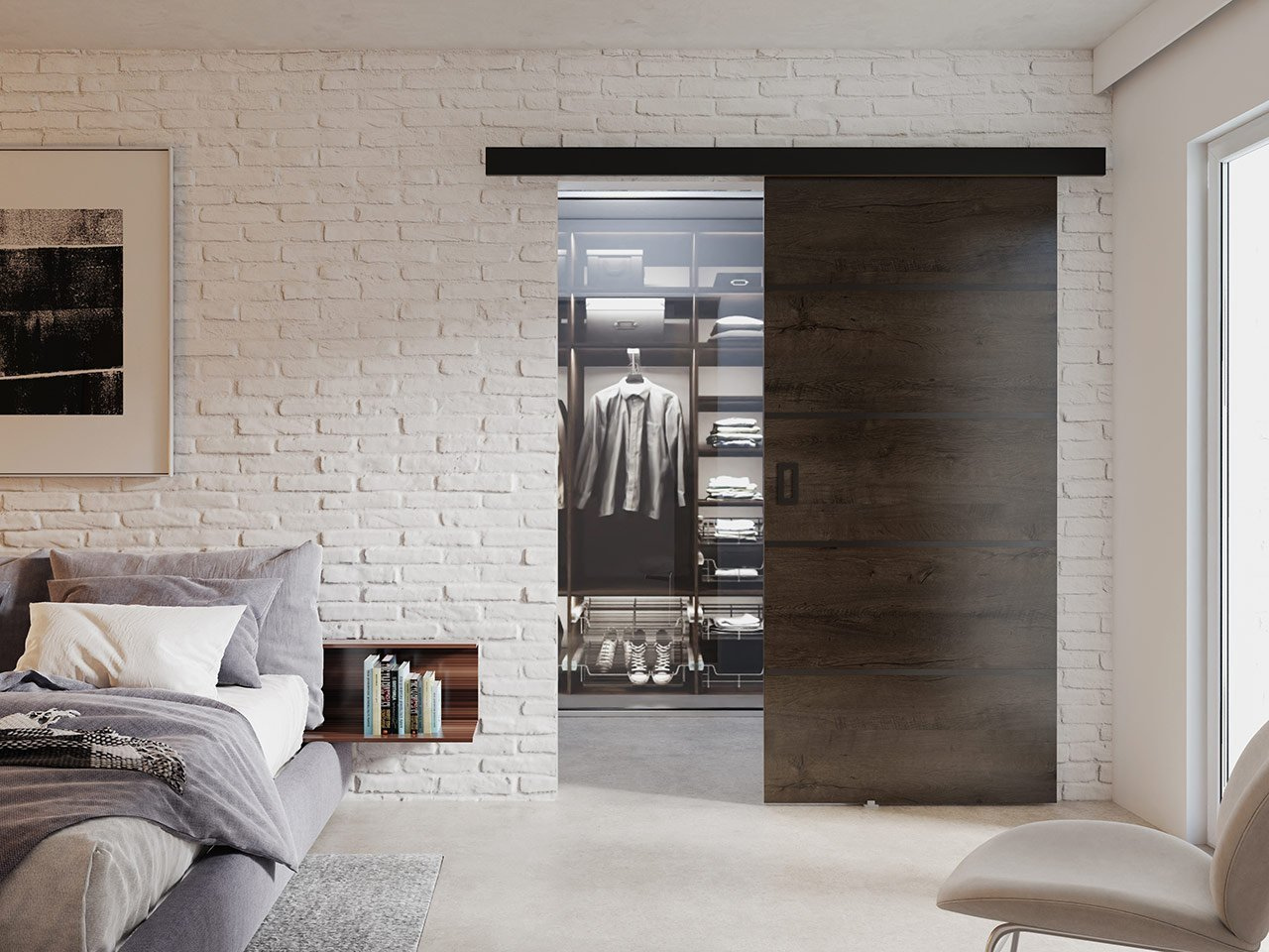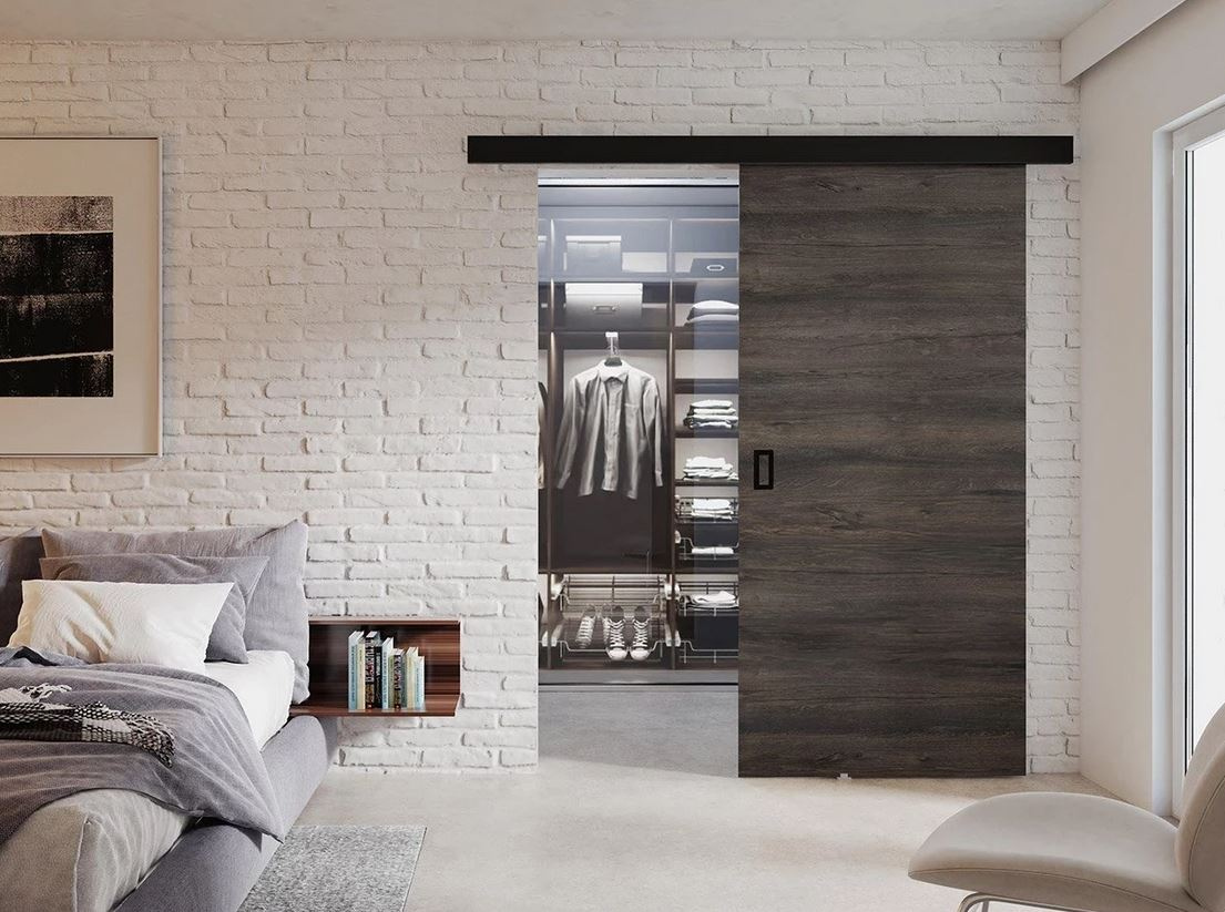 - dveře se posouvají po vodítku instalovaném nad dveřním rámem