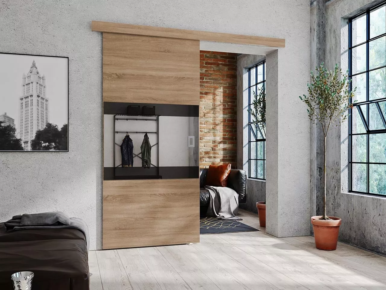 Posuvné interiérové dveře OLIVERIO jsou vyrobeny z vysoce kvalitních materiálů zaručujících bezchybný vzhled a dokonalé odhlučnění interiéru. Praktické zrcadlo zvýrazňuje charakteristický vzhled dveří. Dveře jsou vybaveny samozavíračem, který zabraňuje bouchnutí.
