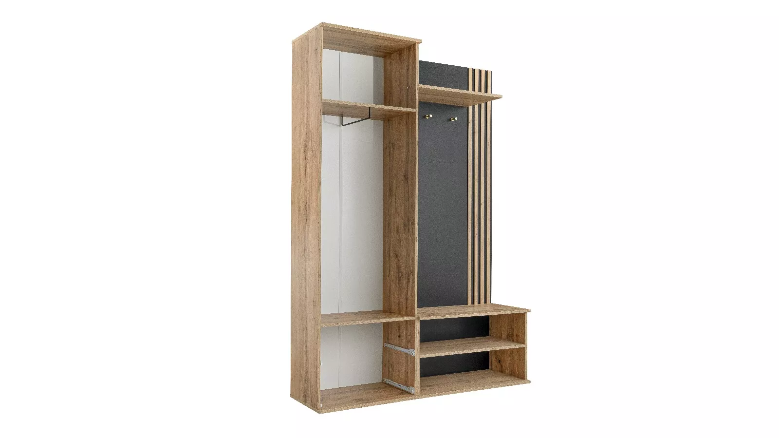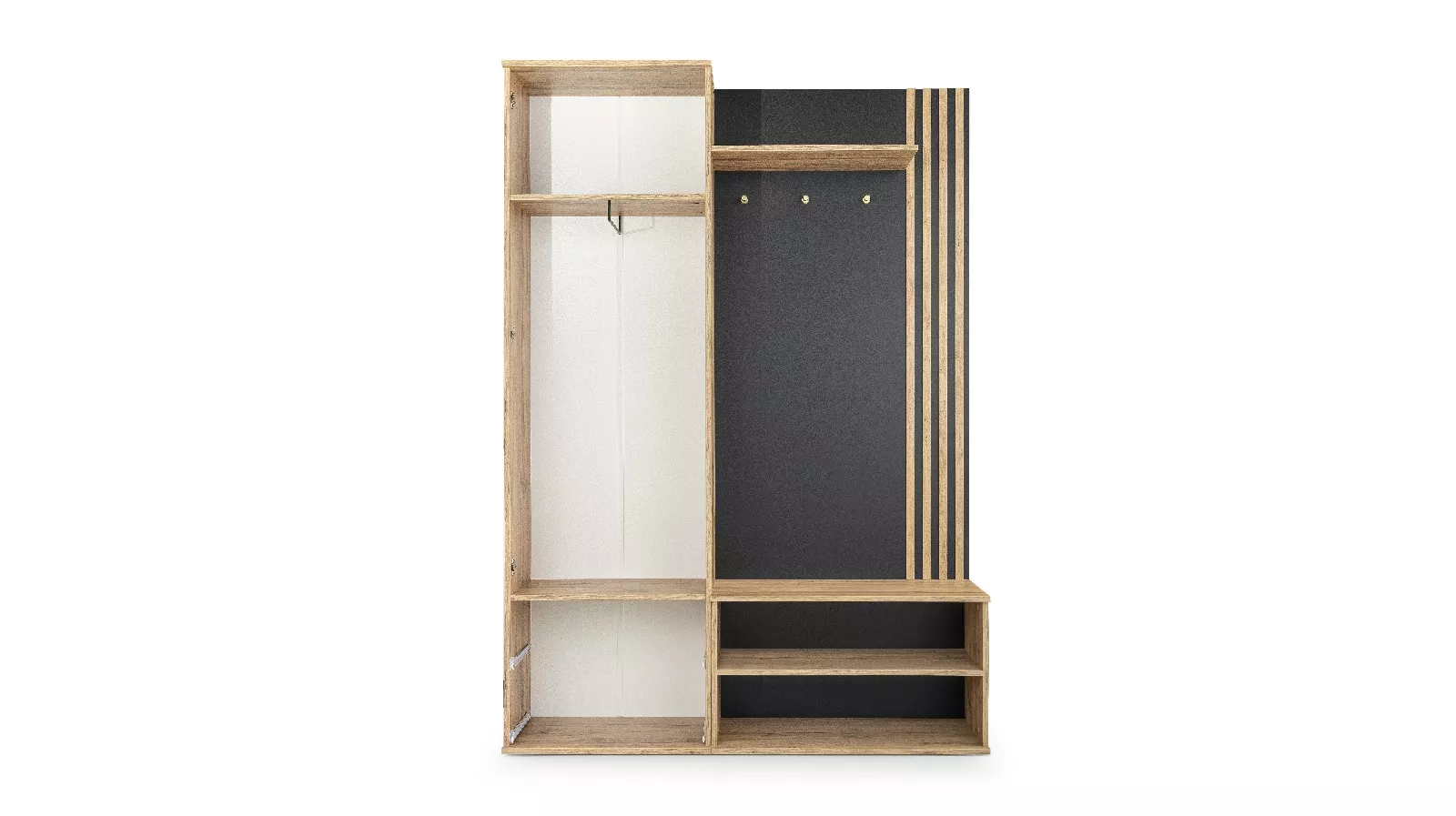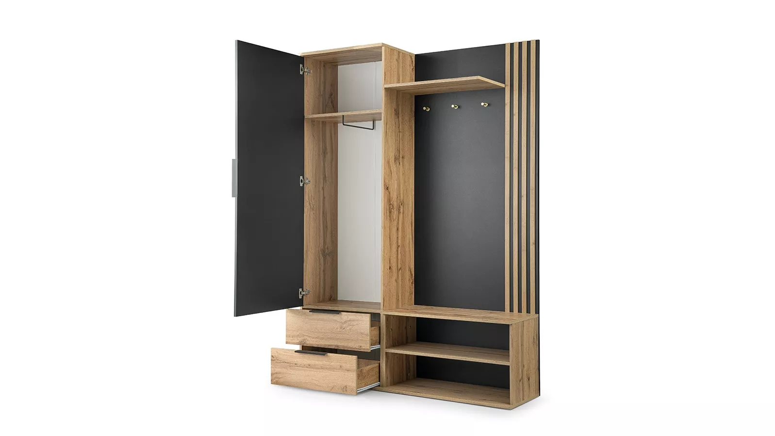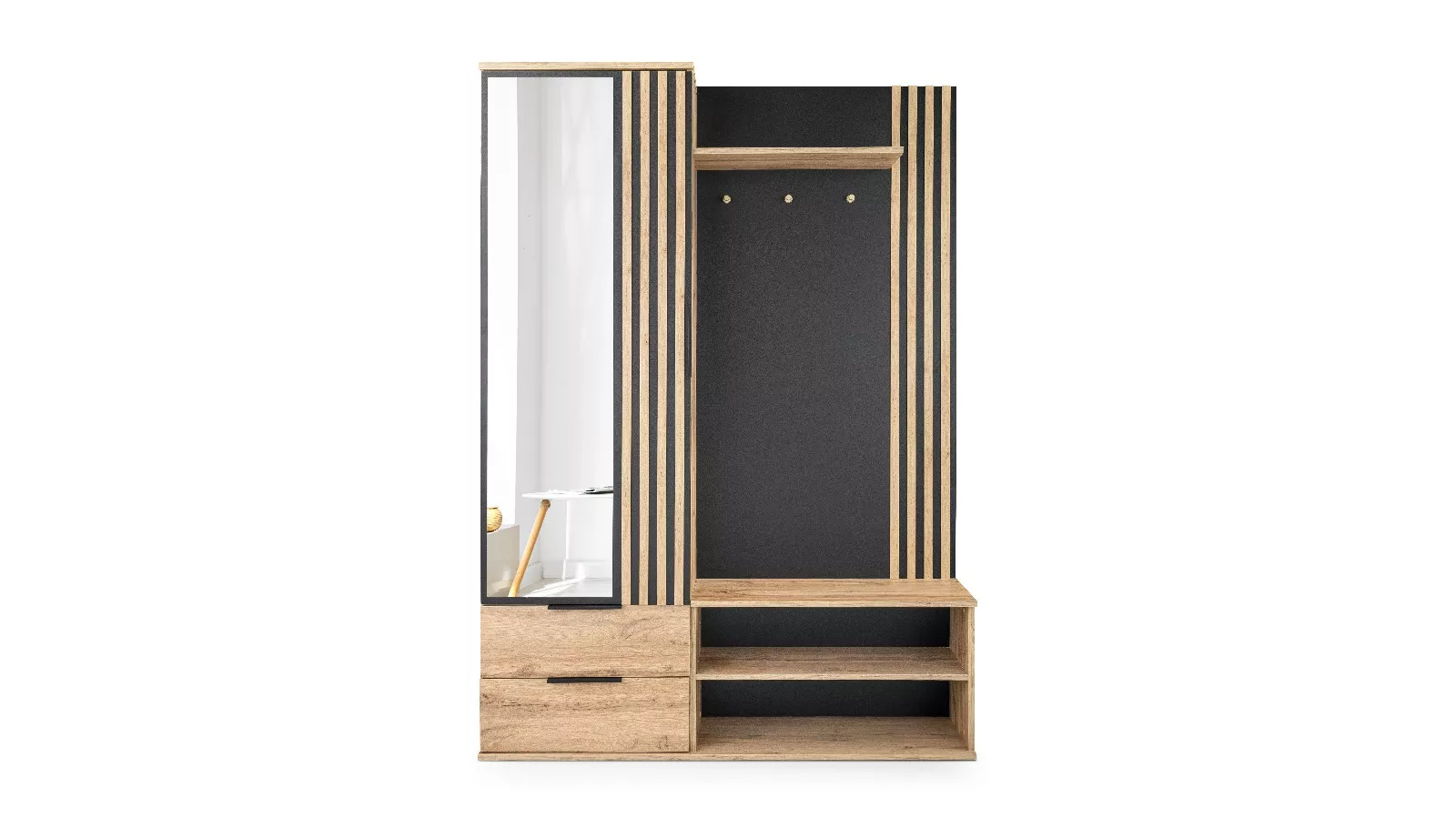 Stěna do předsíně HIMARI je velmi praktický a funkční kus nábytku, který vám pomůže uspořádat prostor v předsíni. Sada obsahuje panel se skříňkou, 3 věšáky, 2 šuplíky, šatní skříň se zrcadlem a polici.