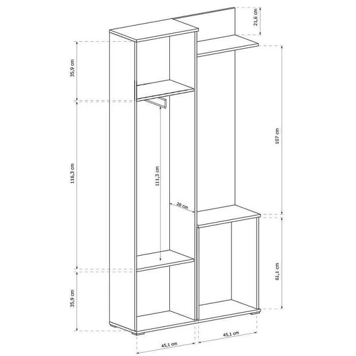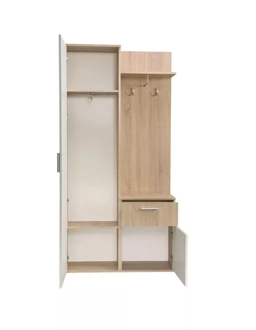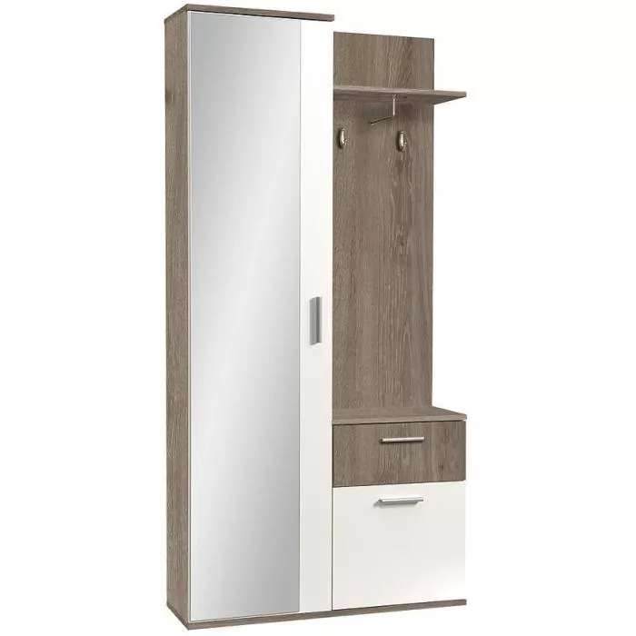 Předsíňová stěna se zrcadlem BAZIL je praktický kus nábytku, který vám pomůže uspořádat prostor v předsíni nebo menší hale. Sestava obsahuje panel se skříňkou, věšáky a šatní skříň s policemi a výsuvnou tyčí.