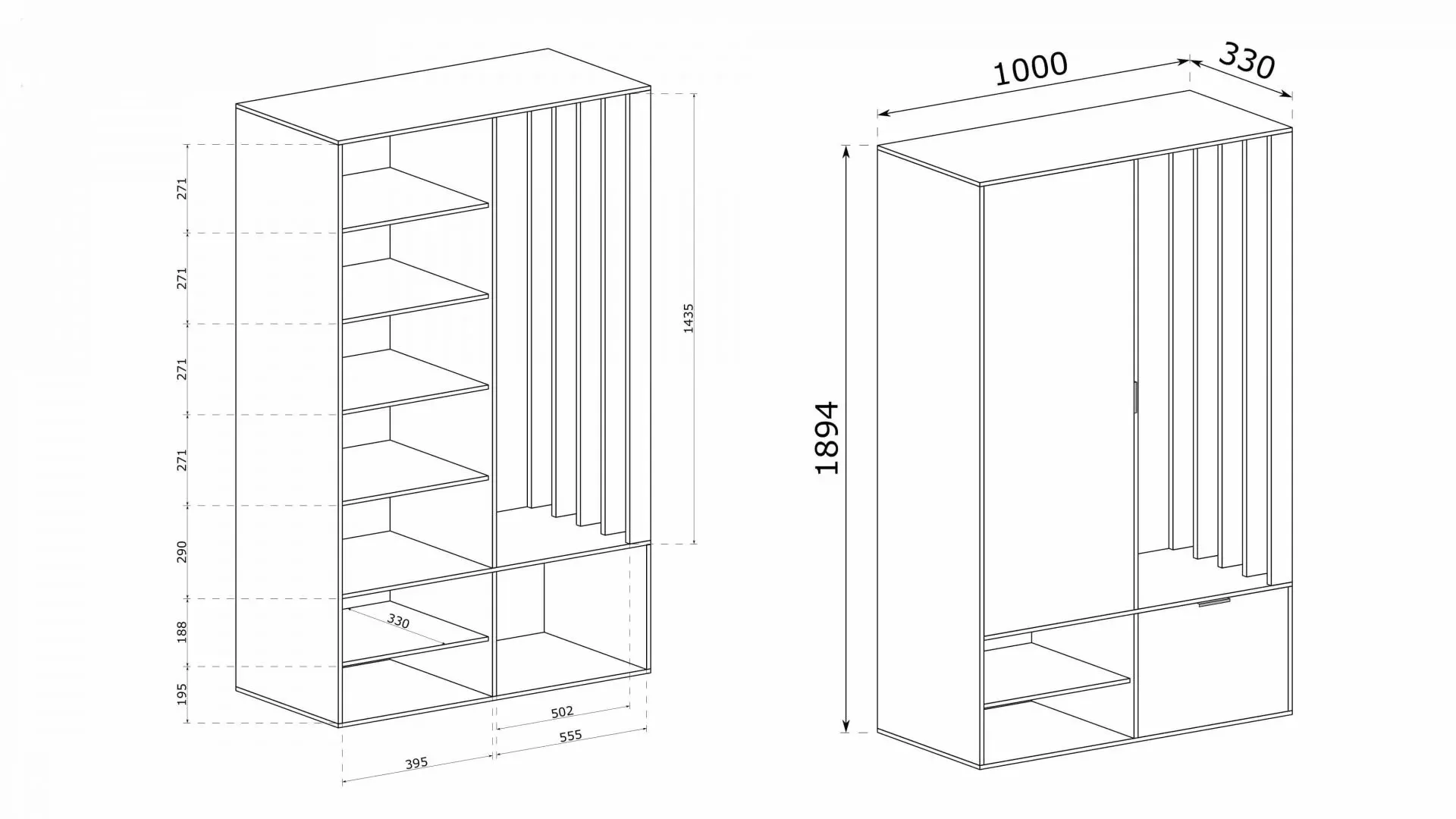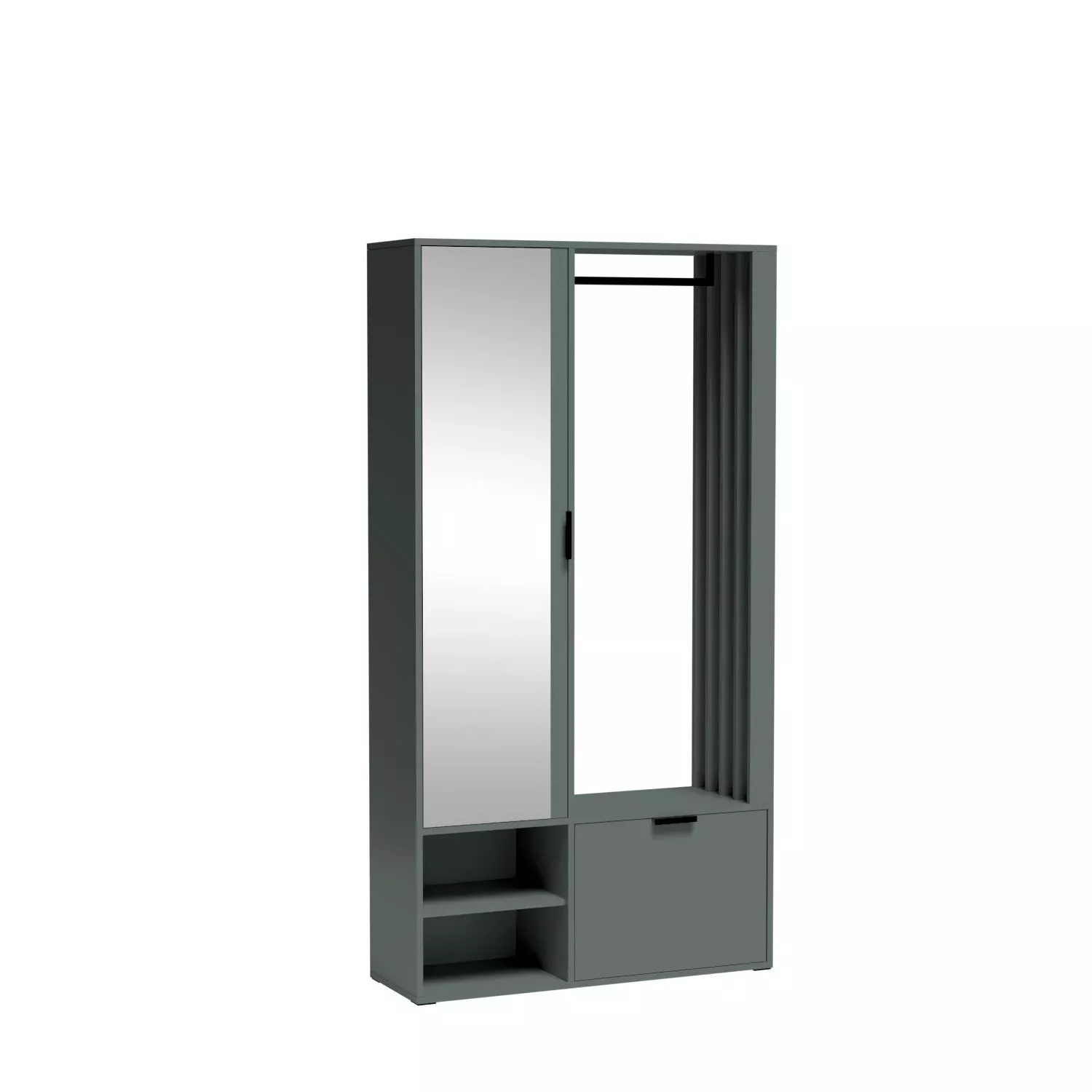 Předsíňová stěna ATHERIA tvoří ucelenou a praktickou sestavu, která dodá vaší předsíni moderní nádech. Stěna je rozdělena na 2 části. Pravá část se skládá ze skříňky s výklopnými dvířky, která může sloužit k ukládání bot, a tyče na zavěšení oblečení. Levá část je tvořena policovou skříní se zrcadlem a 2 otevřenými policemi.