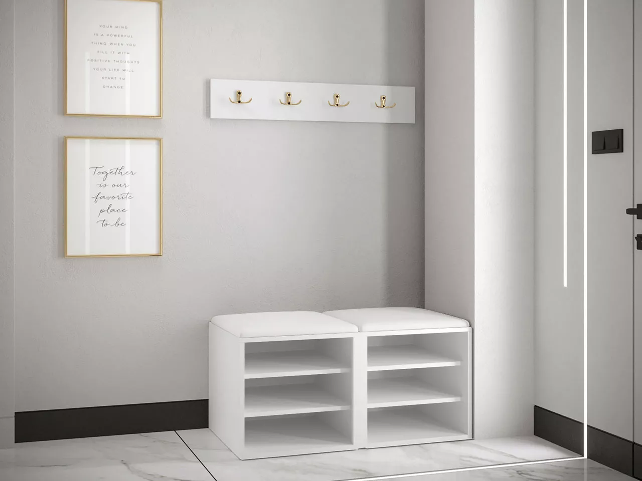 Rozlučte se s chaosem a přivítejte pořádek s elegancí. Stěna do chodby MALIA vám pomůže udržet kabáty a boty přehledně uspořádané. Zlaté úchytky podtrhují sofistikovaný vzhled stěny, zatímco čalouněné panely přidávají pohodlí.