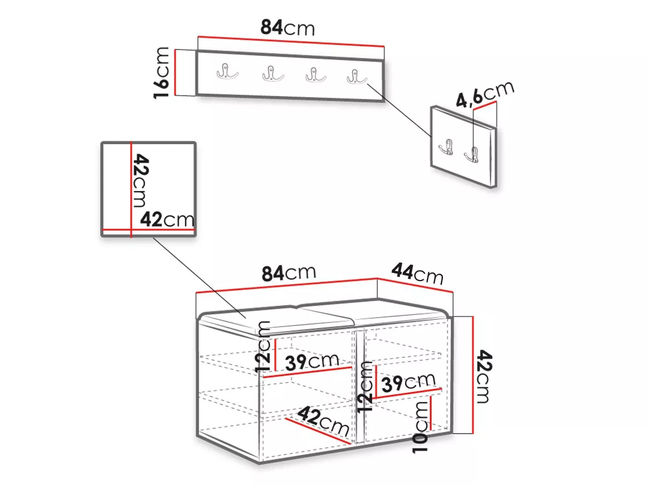 - sedací botník: 84/42/46 cm