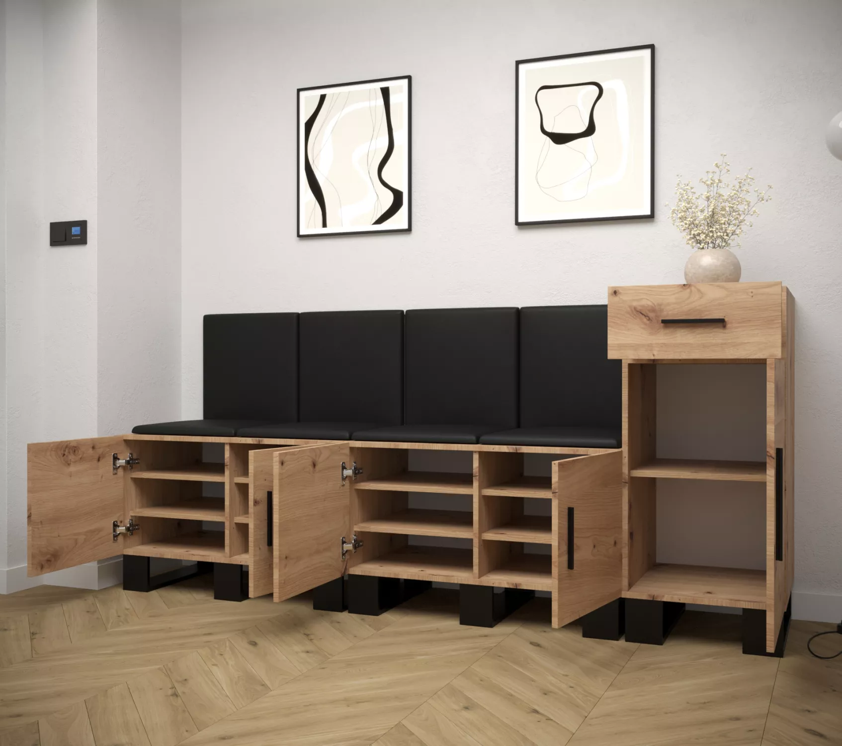 Moderní předsíňová stěna RUMIE promění vstupní zónu v útulný a prakticky uspořádaný prostor. Nabízí dostatek místa k ukládání věcí i náležité pohodlí při obouvání a vyzouvání bot. Čalouněné panely jsou nejen měkké a příjemné na dotek, ale také úžasně dekorativní.