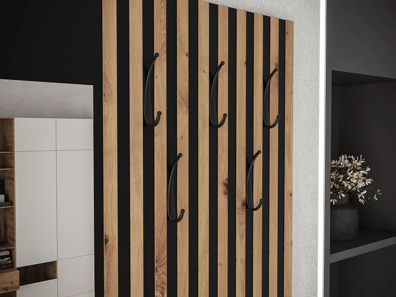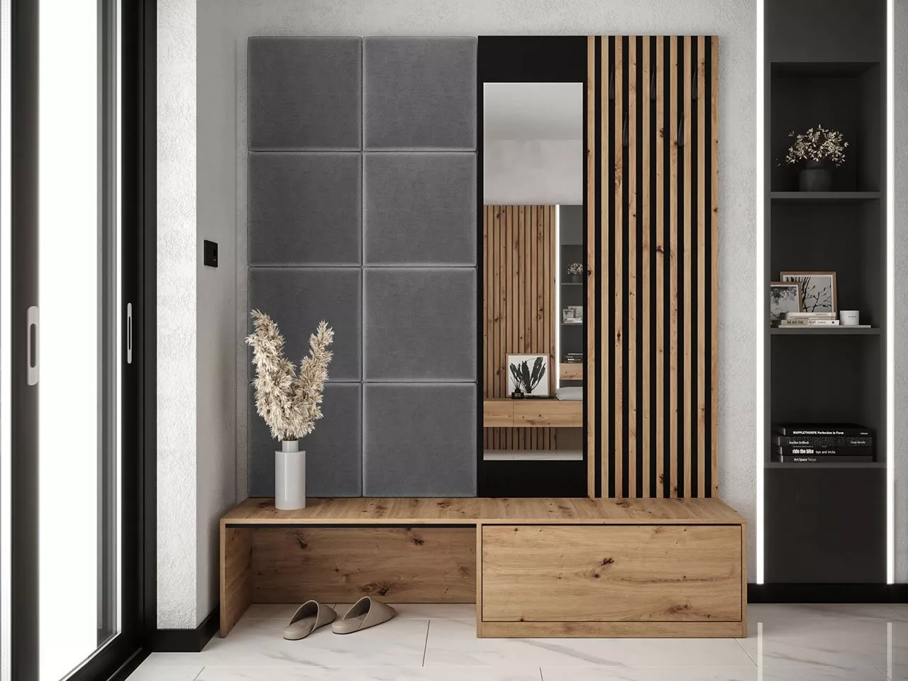 Stěna BRUTTO dokonale zapadne do moderních předsíní, kde pomocí bohaté barevné palety měkkých čalouněných panelů vytvoří tlumený a originální dekor. Stěna se skládá z botníku, který je doplněn nástěnným panelem s dekorativními lištami s věšáky a praktickým zrcadlem.